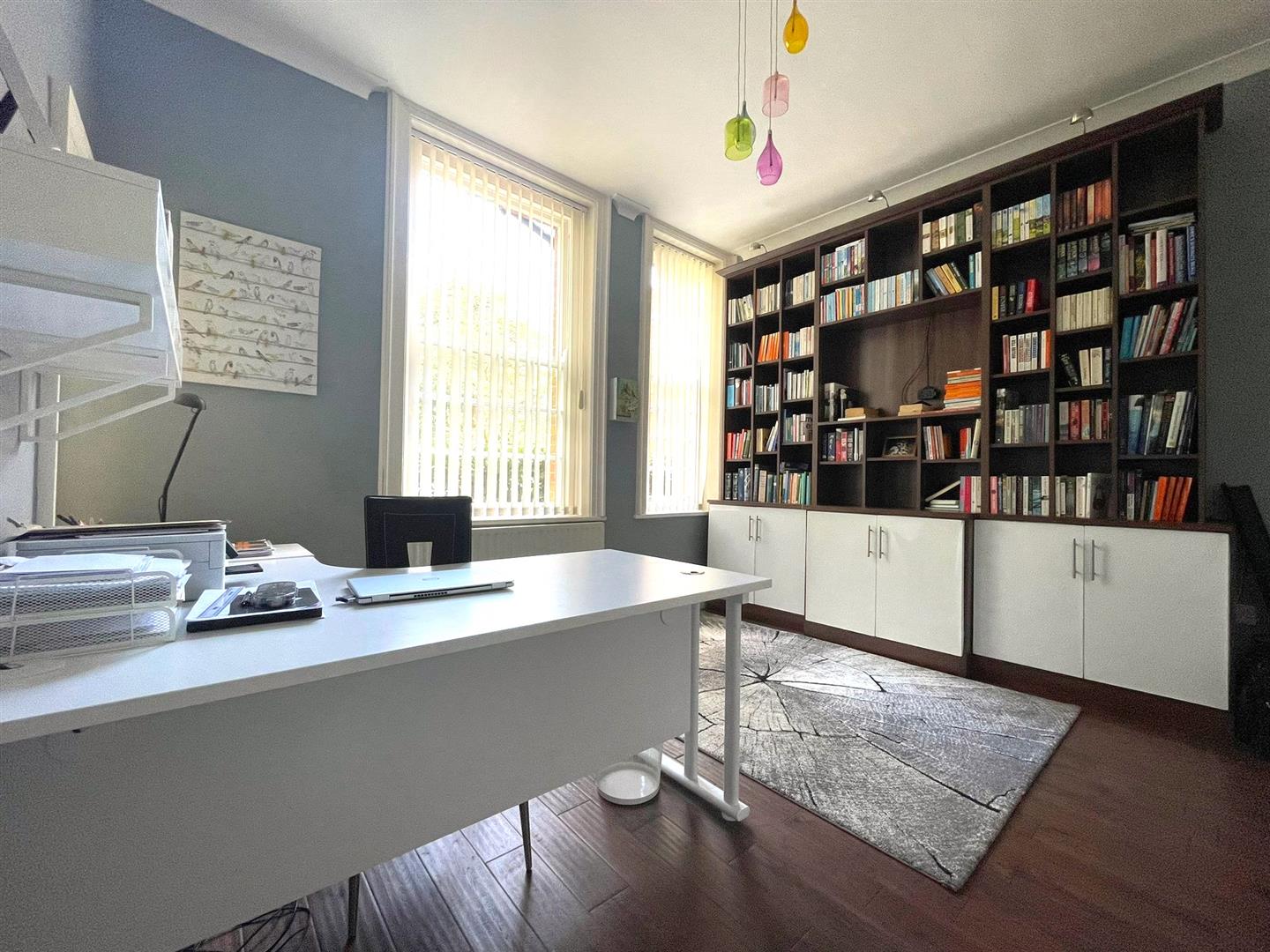 Another large room that is currently used as an office, light fills the space from the three windows. A gorgeous dark wood floor compliments the built-in unit that fills the back wall providing cupboards and book shelving. The room also has a radiator to one wall.