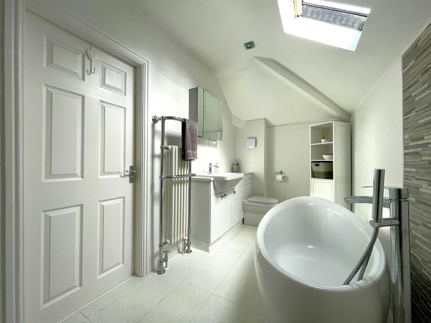 An impressive en-suite to compliment the stunning master bedroom. With sleek and stylish tiled walls and flooring, vanity unit housing sink and W.C, gorgeous free-standing pebble bath and step in shower. A Velux window allows light to pour into the room the heated towel rail on the radiator will keep your towels toasty until you need then and an extractor fan provides sufficient ventilation.