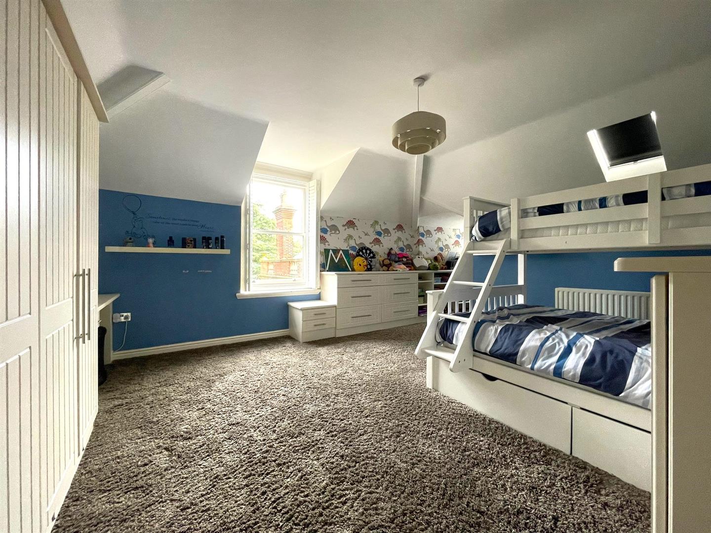 Across the hall from the master suite is another great sized bedroom, this again benefits from a huge amount of built in storage, wardrobes, drawers, shelving and a desk along with two normal and one Velux window, carpeted flooring and radiator.