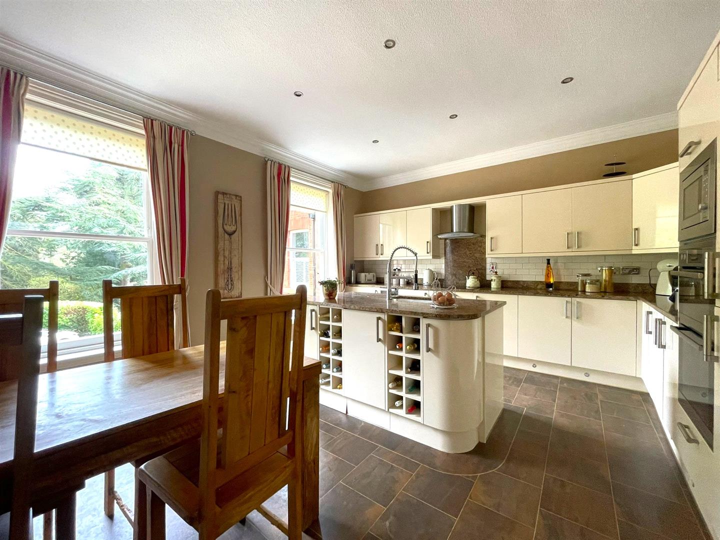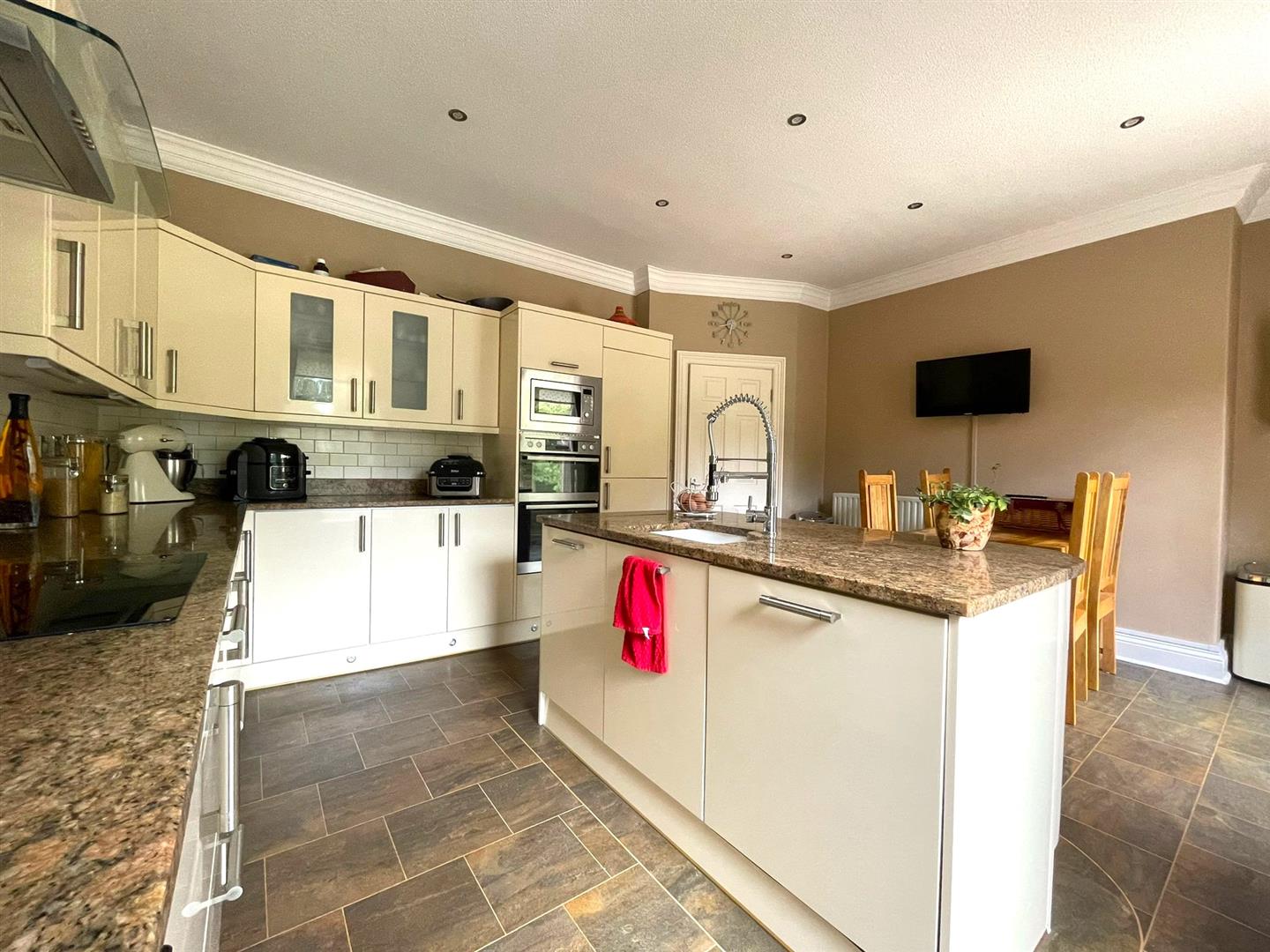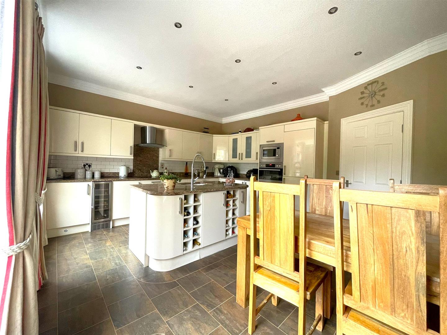 This beautiful space has a traditional feel with it's warm colour scheme whilst providing all the mod-cons you would expect from a high spec modern kitchen. There are fitted wall and base units stretching across two walls with high gloss, cream doors and granite worktops. The large island houses a sink with spray tap, dishwasher, wine racks and additional storage. There is a built in oven, double microwave, hob, fridge freezer, wine fridge and extractor fan. With ample space for a table and chairs you can cook and entertain or enjoy family time all in one! Spotlights to ceiling, tiled laminate flooring, two sash windows and a radiator complete this stunning room.