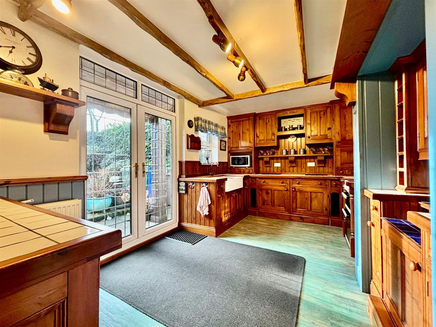 French doors out to garden, window to rear of property, fitted wall and base units, wooden work surfaces, double Belfast sink, electric cooker point, part panelled walls, space for freestanding oven, space for fridge-freezer, laminate flooring, part tiled walls, radiator.