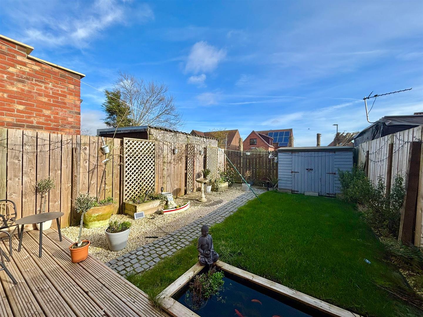 The garden is laid mainly to lawn with a part-gravelled area and ornamental pathway. Enclosed by fenced boundaries with planted borders and a decked seating area.