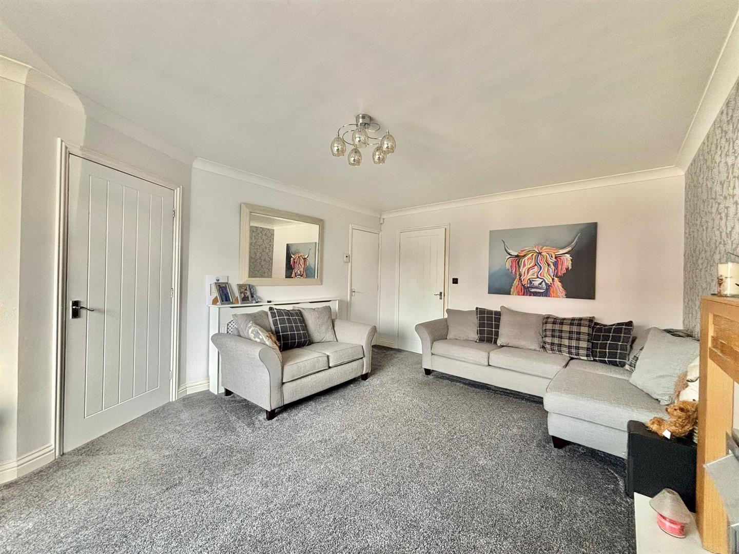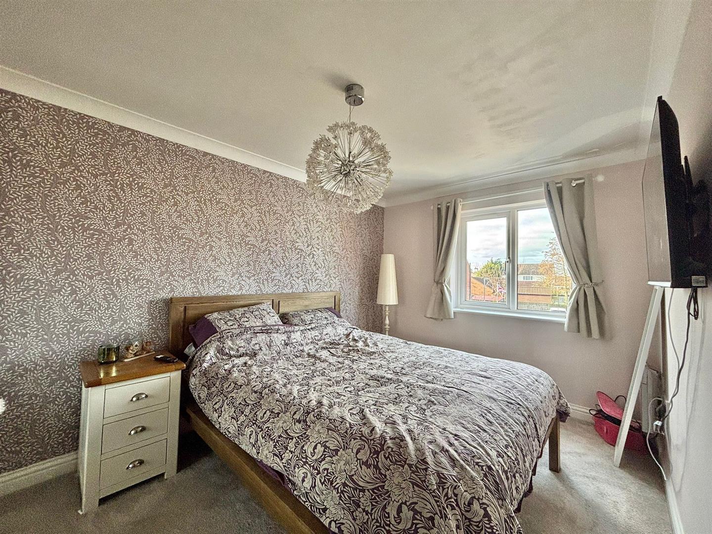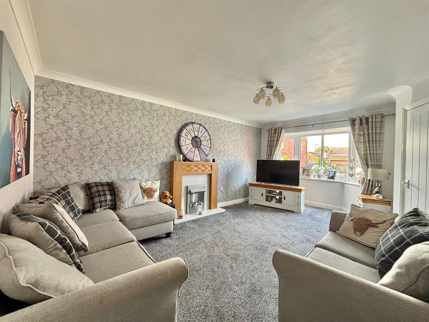 Front facing bay window, Electric fireplace, Coving ceiling, Econ seven radiator and carpeted.