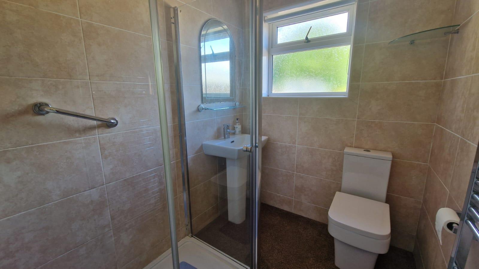 Window to rear, W.C, pedestal hand wash basin, step in shower, heated towel rail, tiled walls, carpet and wall heater.