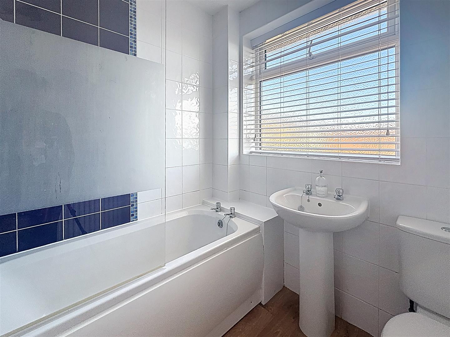 Window to rear of property, W.C, pedestal hand wash basin, panelled bath with shower over, tiled walls radiator, vinyl flooring.