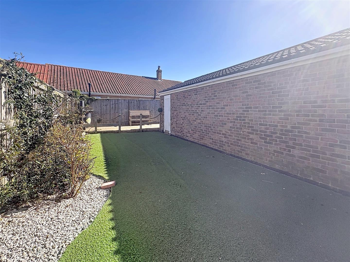 Laid mainly to artificial lawn, paved area, fenced boundaries, planted borders, raised decked area.