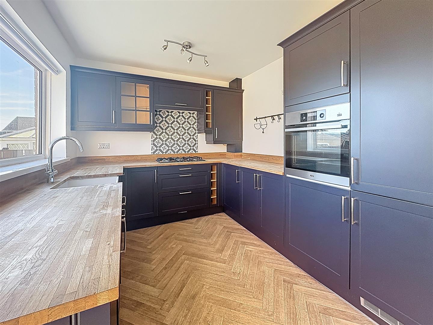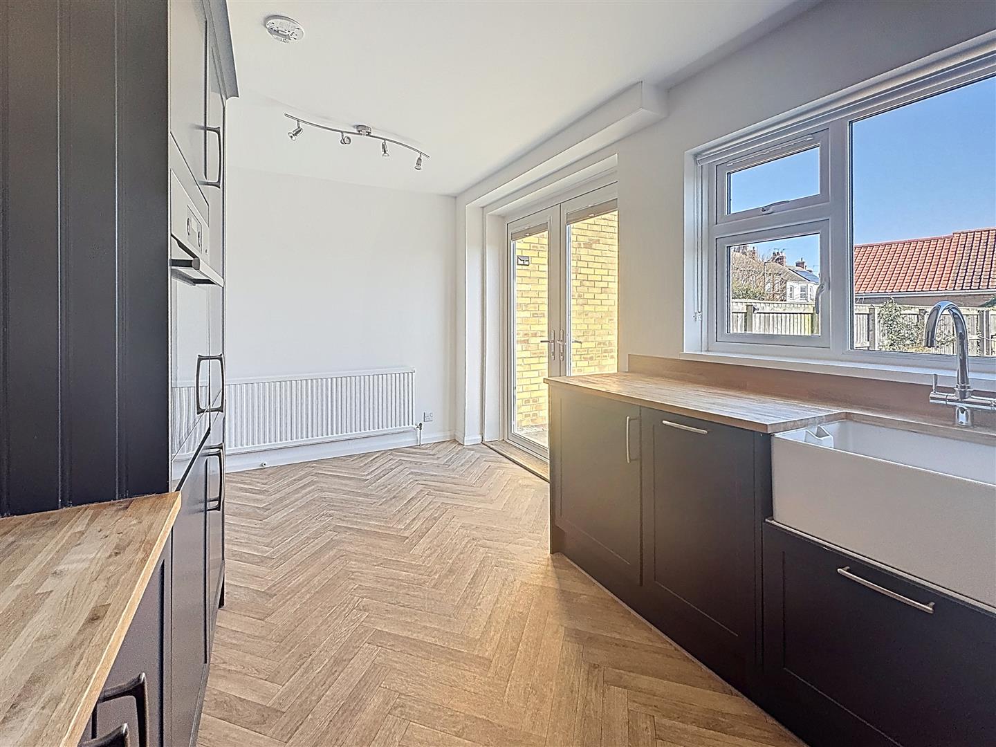 Window to rear of property, French doors to garden, fitted wall and base units, wood work surfaces, Belfast sink, gas hob and built in electric oven, integrated slimline dishwasher, fridge freezer and washing machine, extractor fan, radiator, vinyl flooring.