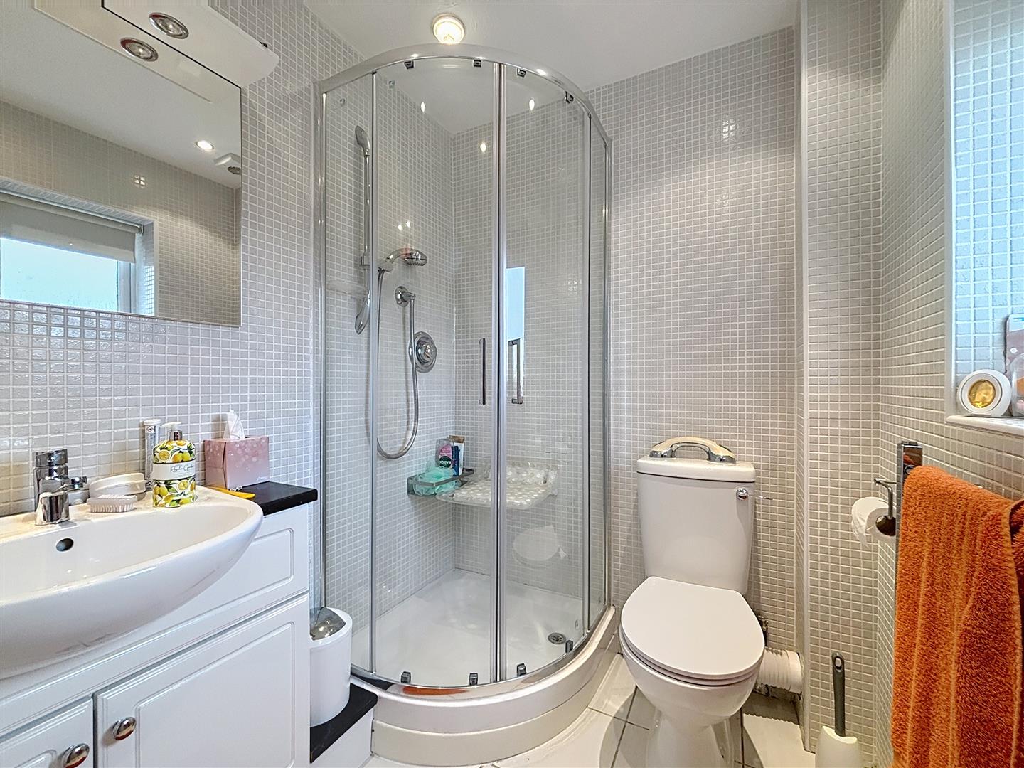 Window to front, WC, hand wash basin with storage under, step in shower. Tiled walls and flooring, extractor fan, heated towel rail and spotlights.