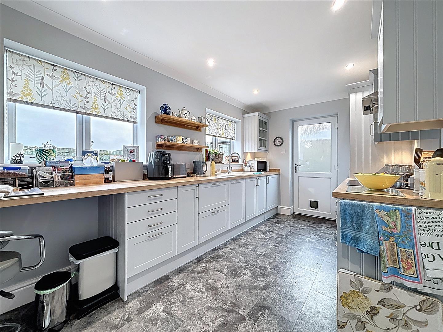 Two windows to rear, UPVC door to side, fitted wall and base units with work surfaces, built in electric oven with gas hob and extractor hood over. Integrated fridge/freezer, slimline dishwasher and washing machine. Partially tiled walls, tiled flooring, coving to ceiling and radiator.