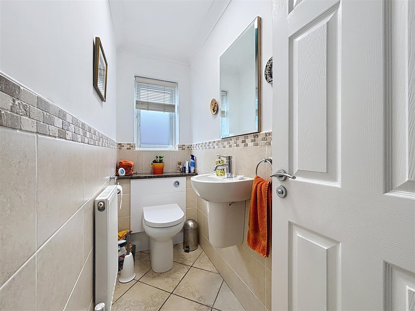 Window to side, WC, wash hand basin, coving to ceiling, part tiled walls and radiator.