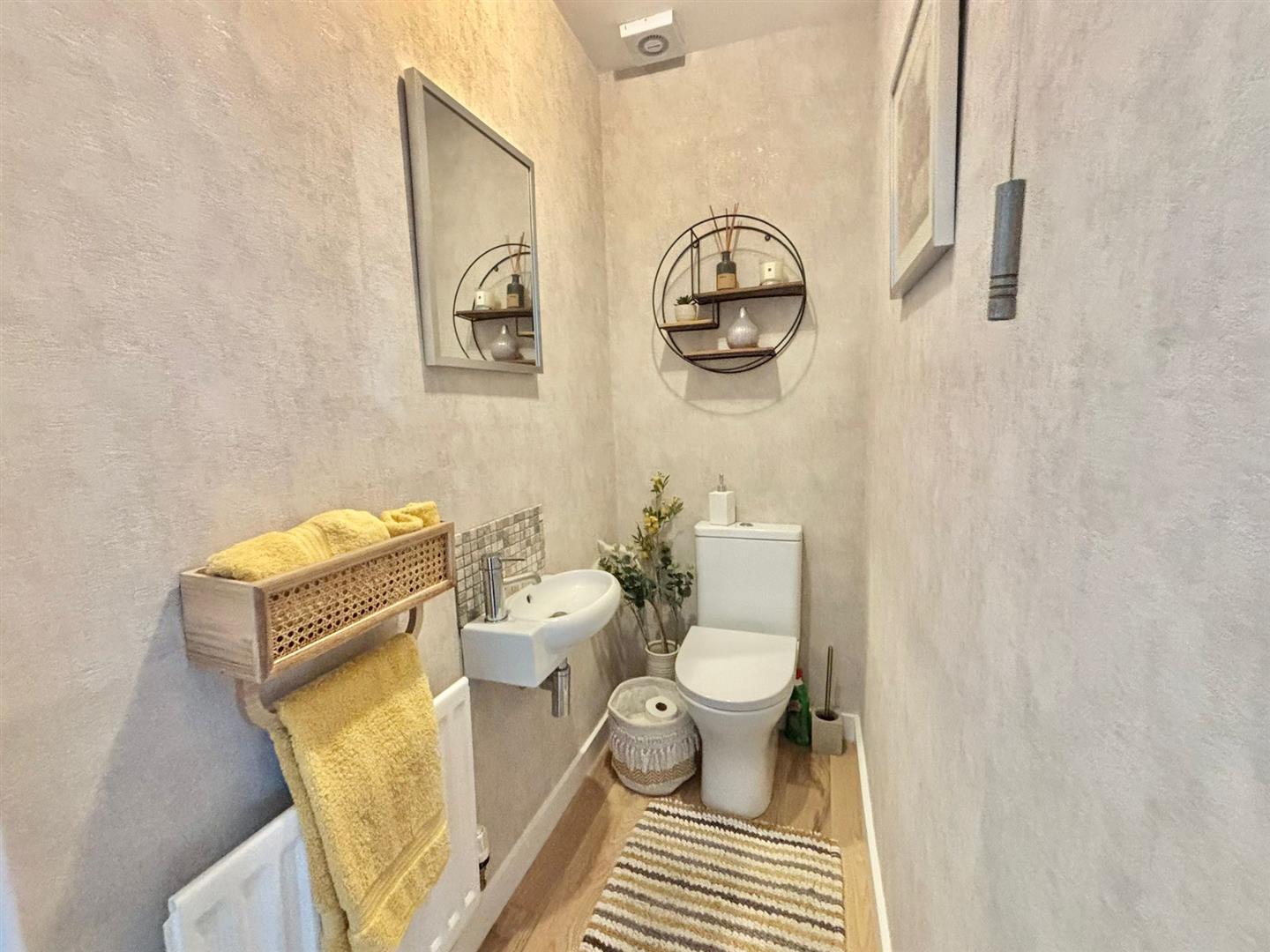 Fitted with a wash hand basin and WC, complemented by a partly tiled backsplash. The room also benefits from an extractor fan, radiator, and wood flooring.