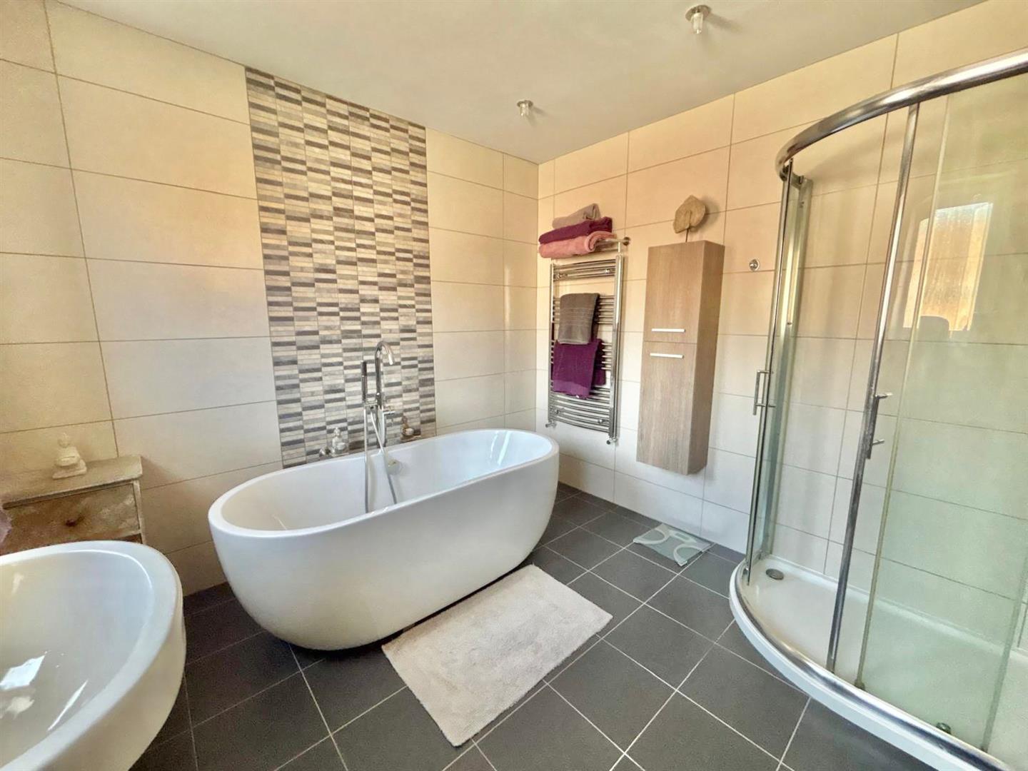 Featuring fully tiled walls and floors, two side-facing windows allowing natural light, and a heated towel rail. The suite comprises a WC, pedestal hand wash basin, freestanding bath, and a step-in shower cubicle. An extractor fan is also installed for ventilation.