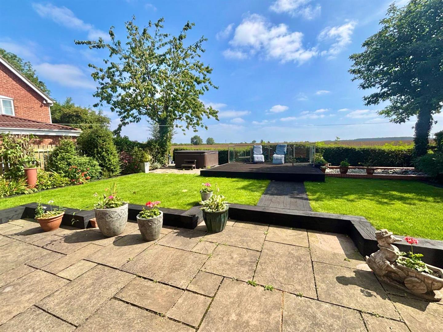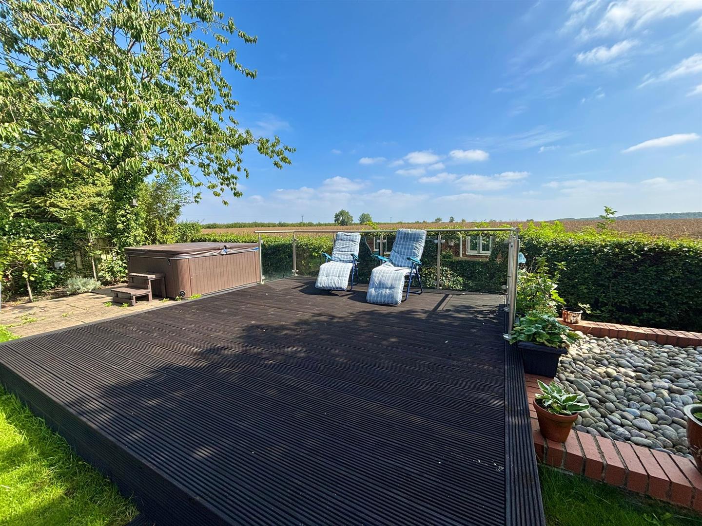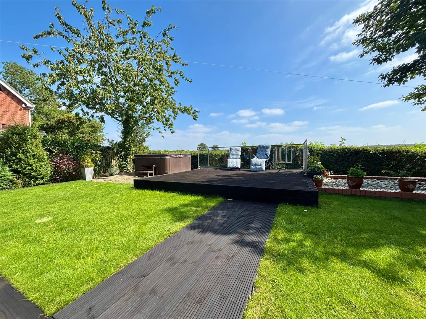 Generous garden laid mainly to lawn, featuring two separate patio-paved areas ideal for outdoor dining and entertaining. The garden is enclosed by a combination of fencing and mature hedging, with well-maintained planted borders adding character. A raised decked area provides an additional seating space and houses a hot tub for relaxation.