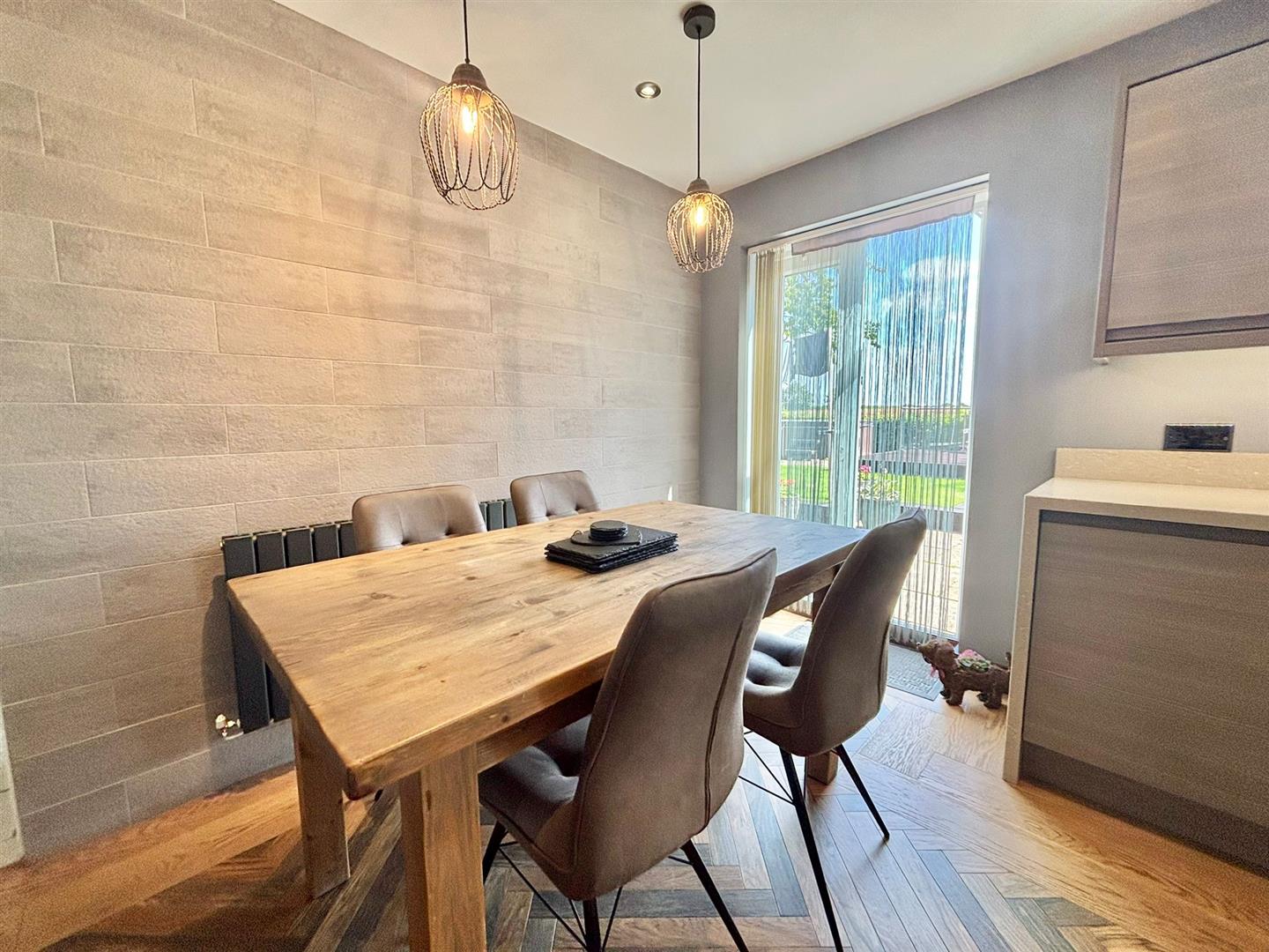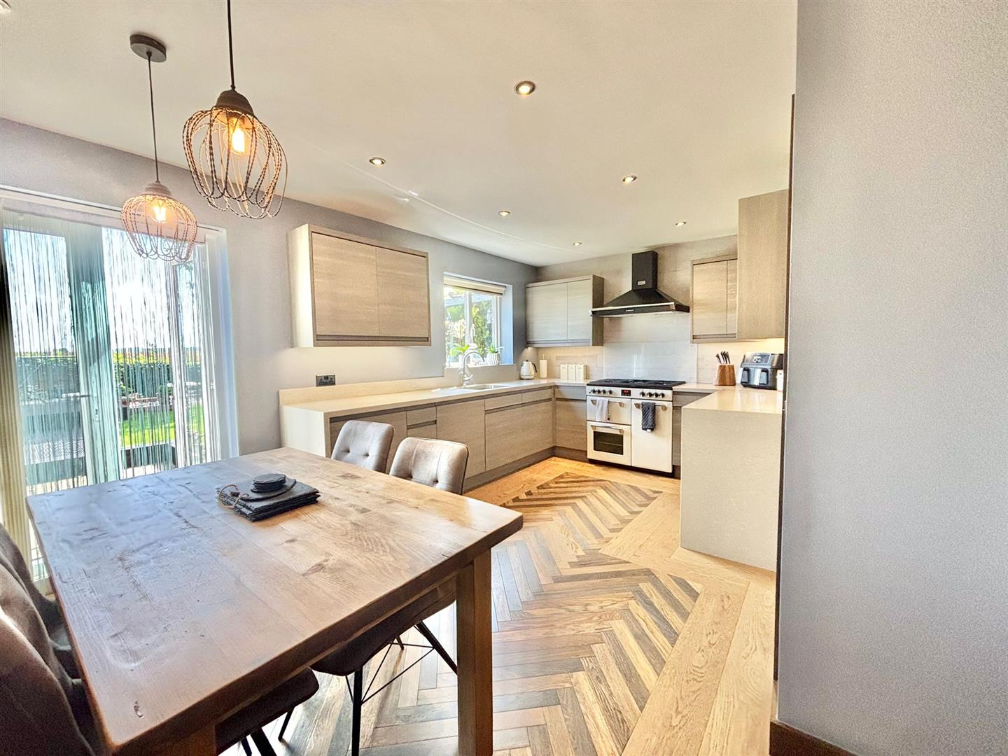Fitted wall and base units, work surfaces, and space for both a washing machine and dryer. Additional features include an extractor fan, radiator, and wooden flooring with provided access to the side of the property as well as an internal door to the garage.