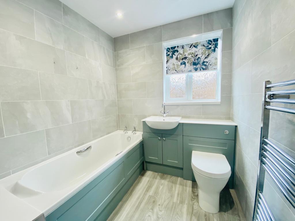 Window to side, vanity wash hand basin, w.c and panelled bath. Heated towel rail, laminate flooring and tiled walls.