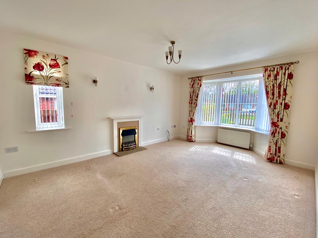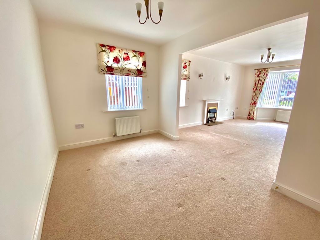 Bay window to the front and window to side, fireplace with electric fire, square arch to dining room and radiator.