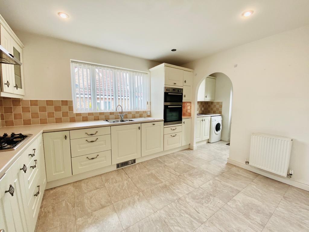 Window to rear aspect, a range of fitted wall and base units with complimentary work surfaces, with stainless single drainer and one and a half bowl sink unit. Gas hob with double built in electric oven. Fitted dishwasher, extractor fan and part tiled walls. Laminate tiles, spotlights and arch to utility.