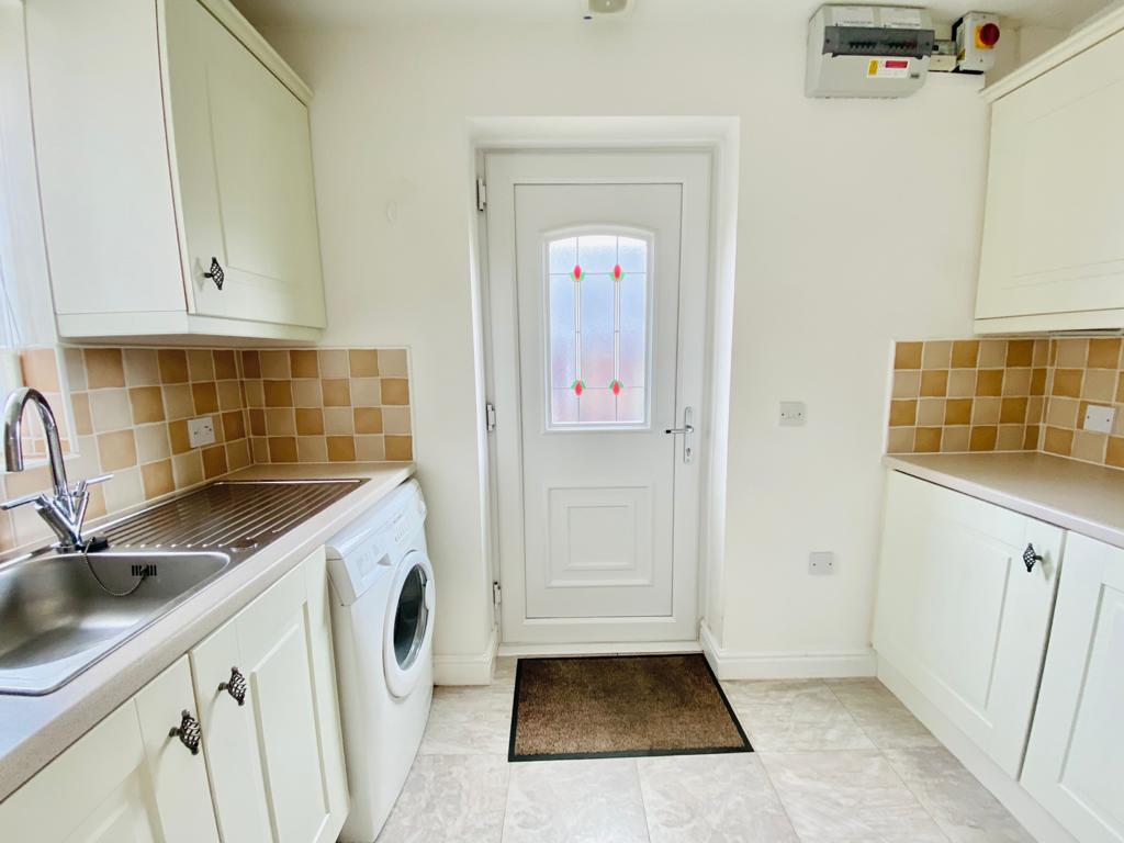 Window to rear aspect with doors to side into the garden, a range of fitted wall and base units with complimentary work surfaces, single drainer and bowl sink unit. Plumbing and space for washing machine, extractor fan, radiator and laminate tiles. Through arch into kitchen.