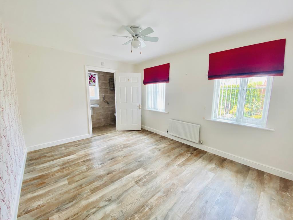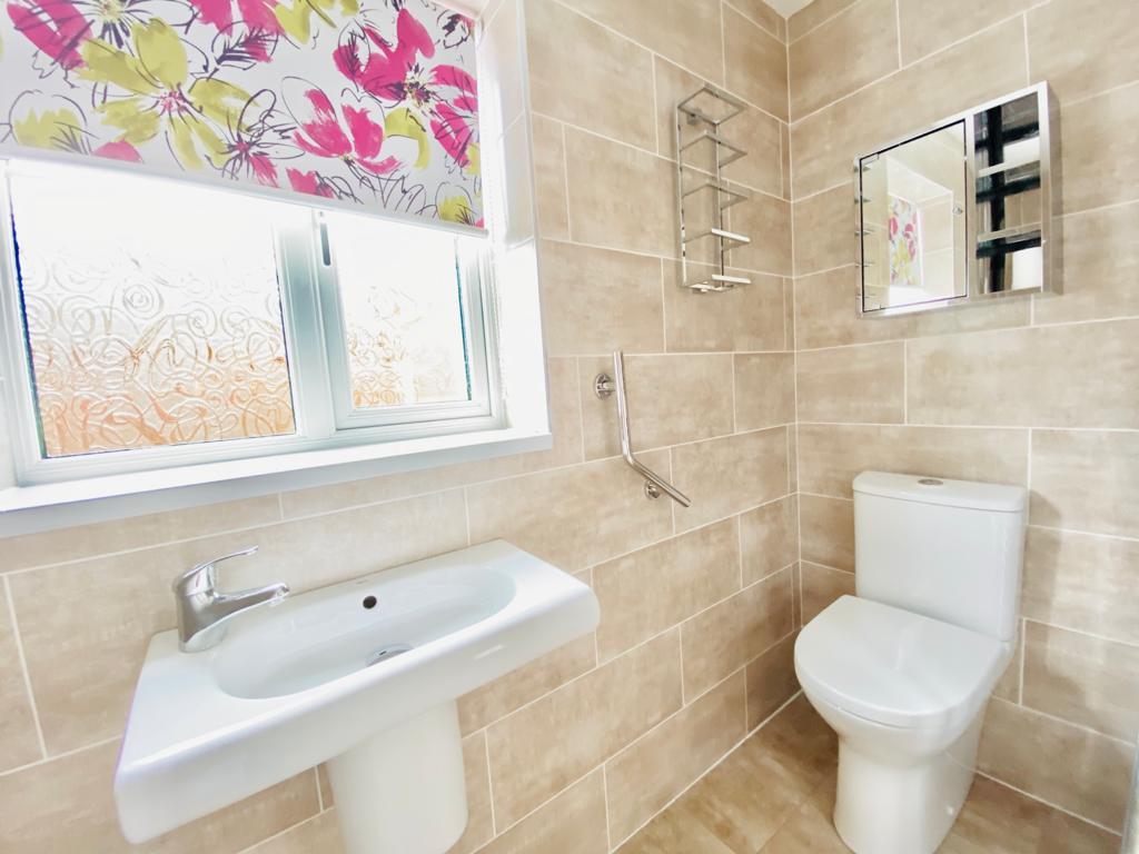 Window to side, wash hand basin, walk in shower and w.c. Heated towel rail, tiled walls and floor, extractor fan.