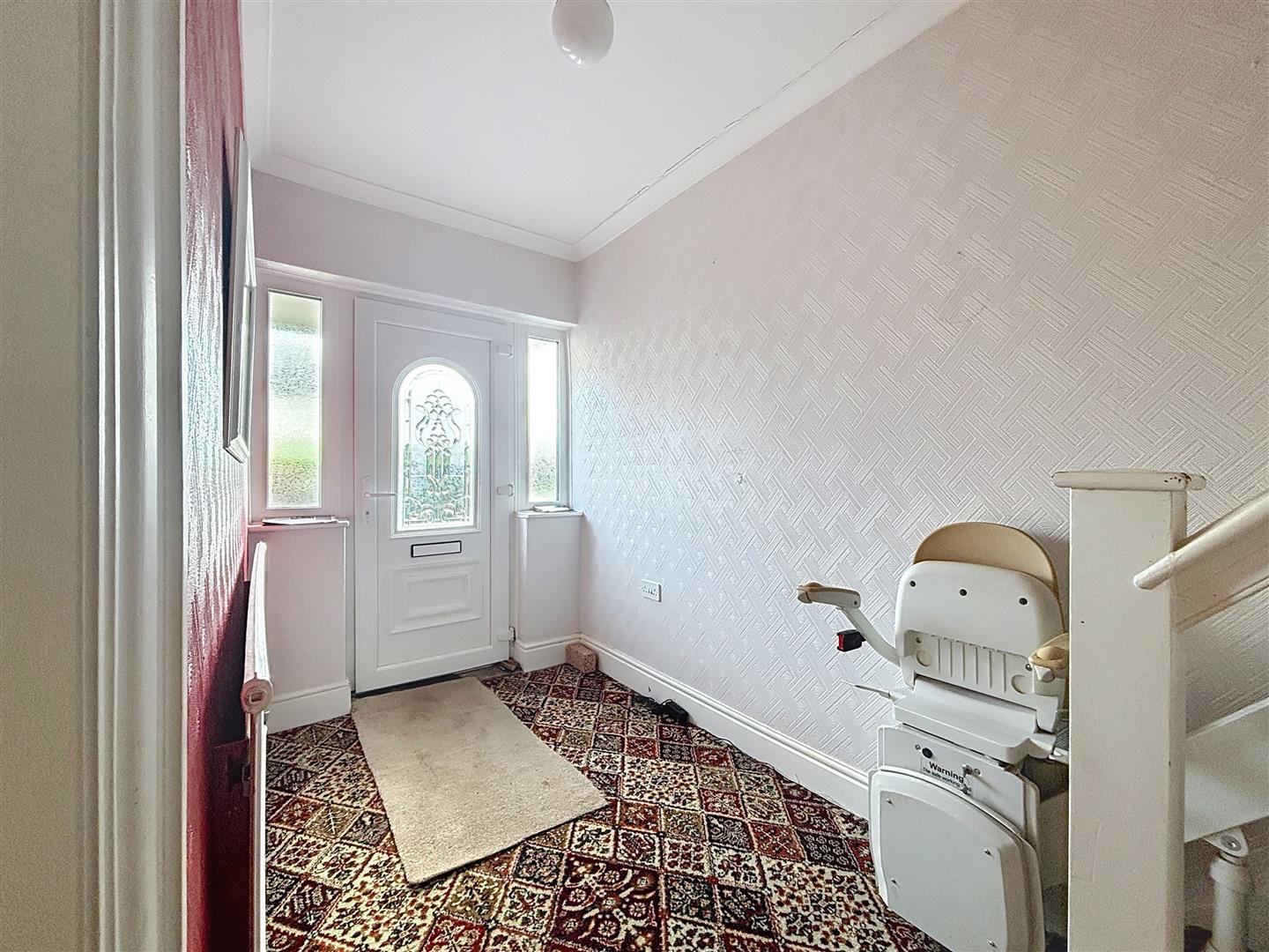 Entrance door leading to carpeted hall and features including, Coving to ceiling, Front facing window, Under stairs cupboard, Radiator and staircase to the first floor.
