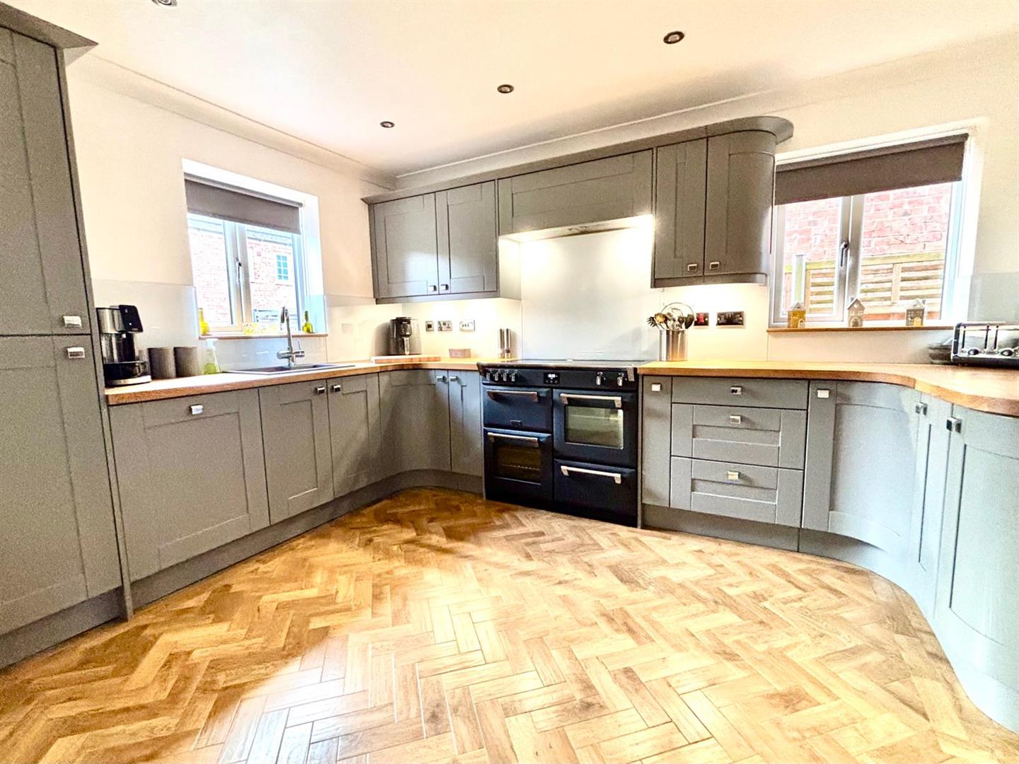Modern fitted base and wall units with wooden work surfaces. one and a half composite sink with single drainer. Windows to the rear and side. Electric cooker point and space for range style oven. Built in fridge freezer and dishwasher. Coving to ceiling, extractor fan and radiator. Door to garage. Karndean Floor.