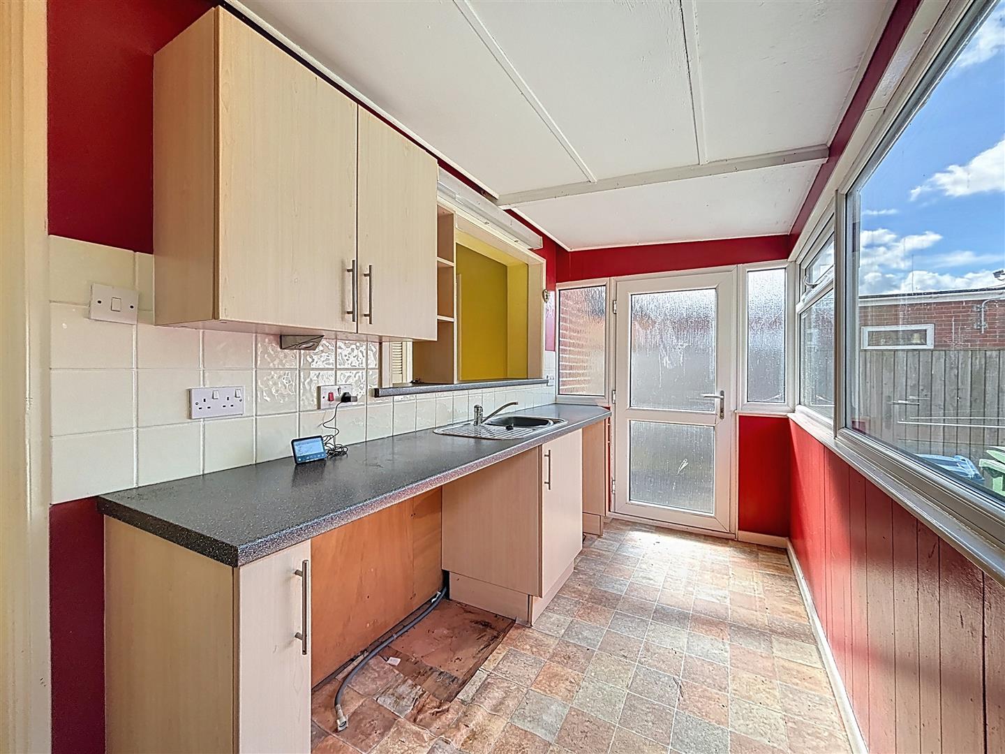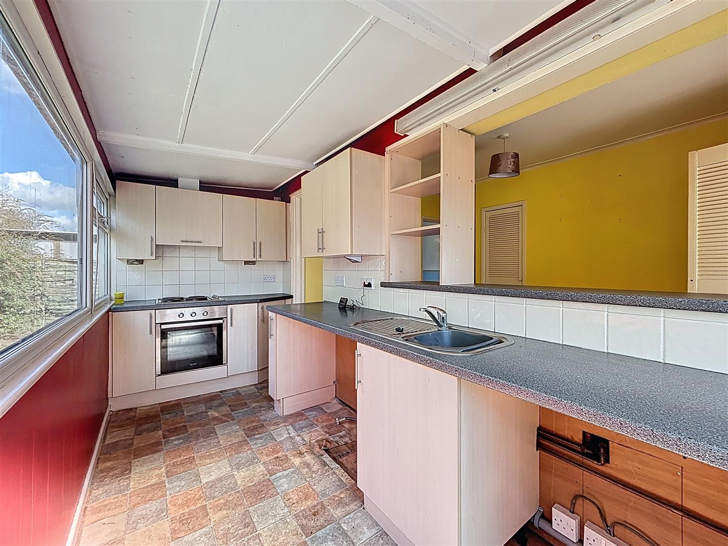 Window to door to rear, fitted wall and base units, stainless steel single drainer and bowl sink, built in electric hob and oven, extractor hood, space for under counter fridge and space and plumbing for washing machine.