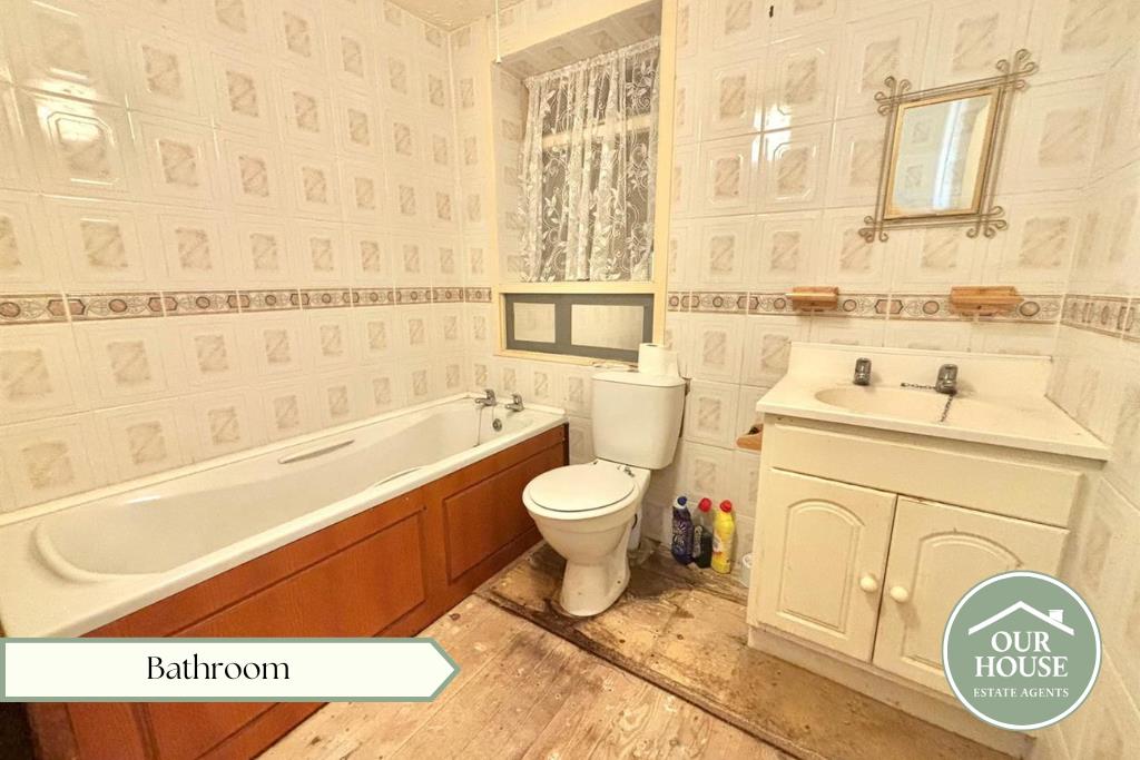 Side aspect window, wash hand basin, W.C, panelled bath, fully tiled walls and radiator.