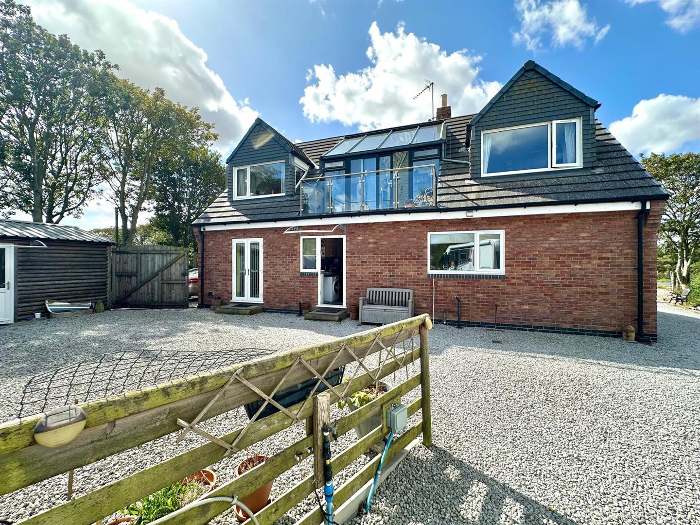 This generous front garden offers an in out, gravelled driveway with parking for twenty and planted boarders surrounding.