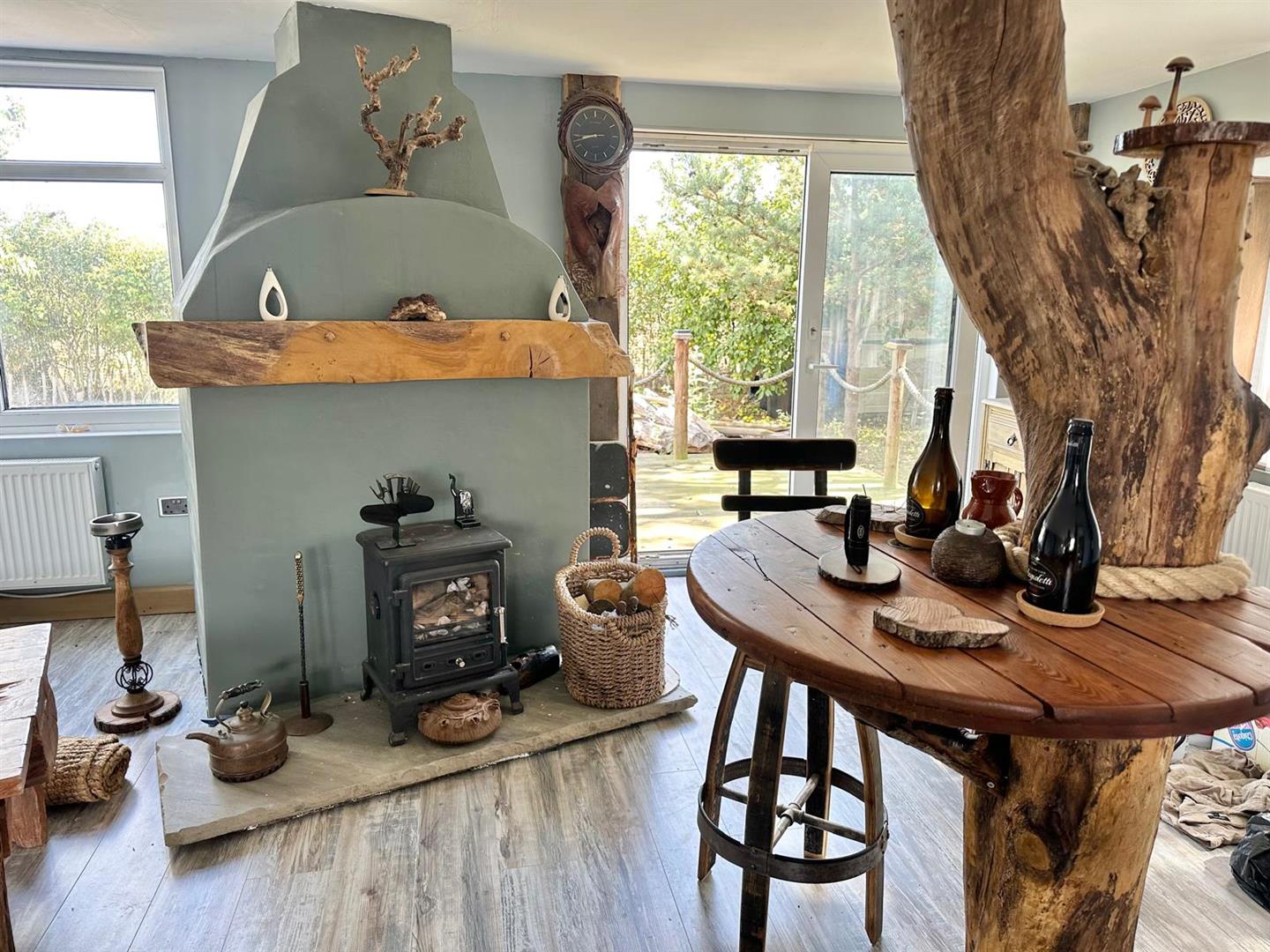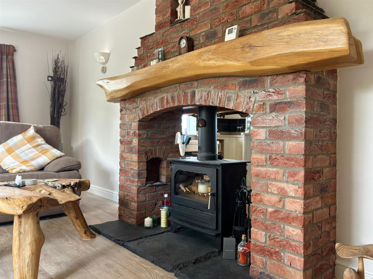 With side and rear-facing windows and doors leading to the garden, this space offers fitted wall and base units with quartz work surfaces, a Belfast-style double ceramic sink, gas hob, built-in electric double oven, extractor fan, and integrated fridge and dishwasher. Additional features include a breakfast island, radiator, laminate flooring, and a character fireplace housing a two-way multi-fuel burner with log mantle.