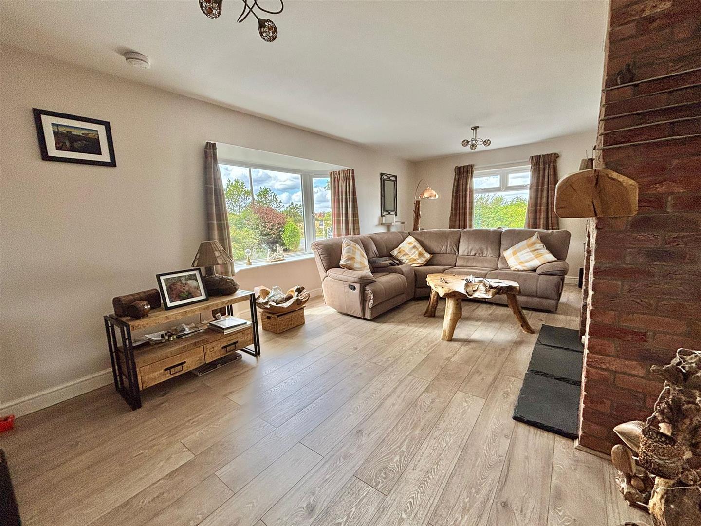 This lounge boasts a front-facing bay window and side window, two radiators, and a feature brick fireplace with a two-way multi-fuel burner, slate hearth, and carved wooden mantle. The room is completed with laminate flooring.