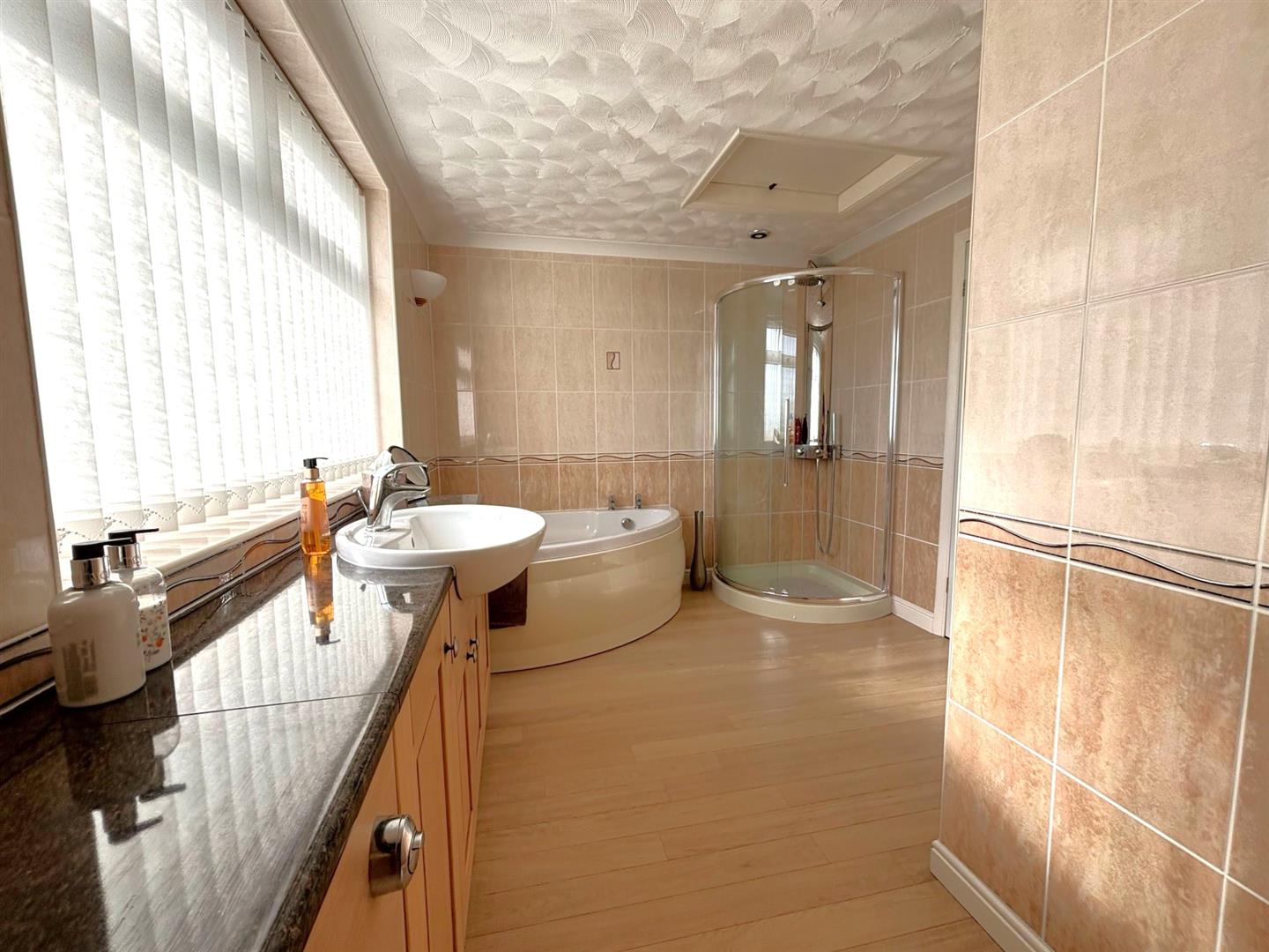 Window to rear of property, W.C and hand wash basin in vanity unit, corner bath, step in shower, heated towel rail, tiled walls, coving to ceiling, LVT flooring.