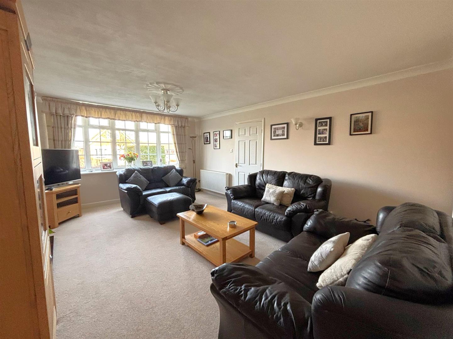 Window to front of property, coving to ceiling, door leading to dining room, fireplace with wooden surround, radiator and carpeted.