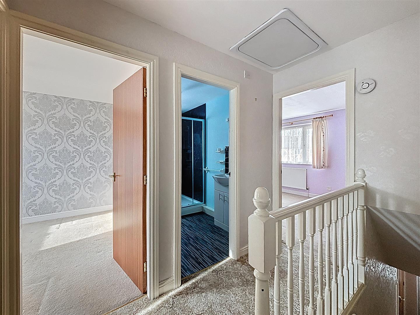 Spindle banister, loft access, carpeted.