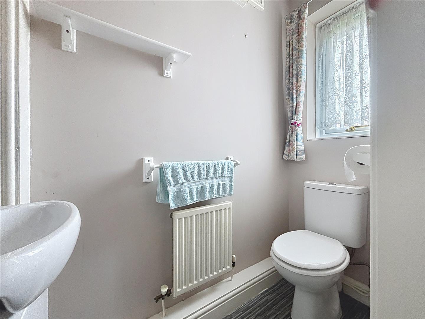 Window to front of property, W.C, hand wash basin with storage under, tiled splash back, extractor fan, radiator, vinyl flooring.