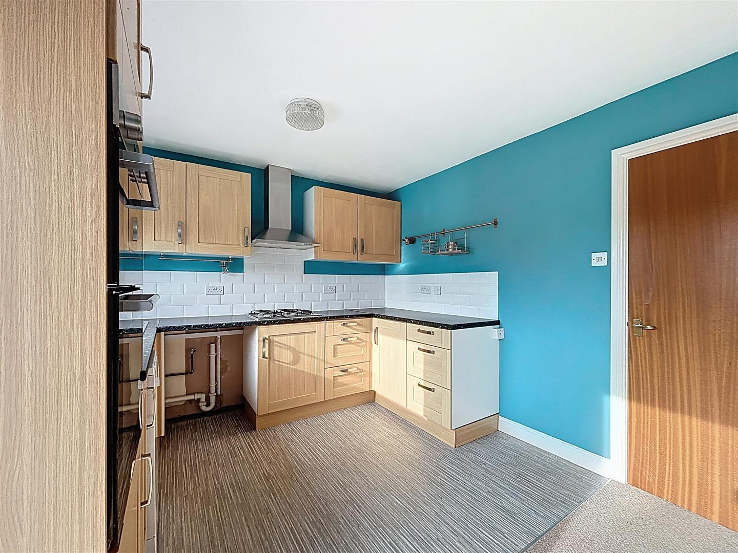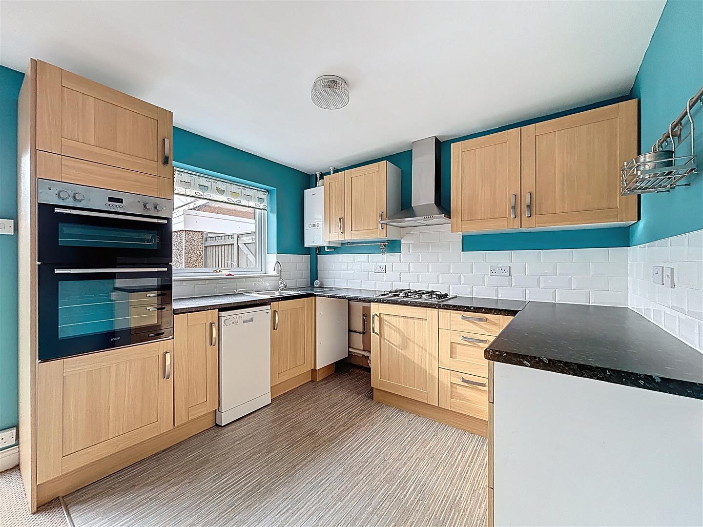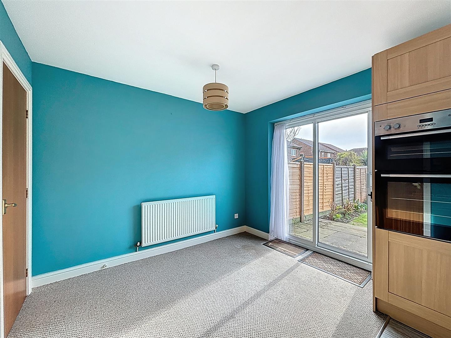 Window to rear of property, patio doors to garden, fitted wall and base units, work surfaces, stainless bowl sink and single drainer, space and plumbing for dishwasher and washing machine, space for fridge freezer, built in electric oven and gas hob, part tiled walls, extractor fan, radiator, vinyl and carpeted flooring, under stairs cupboard.
