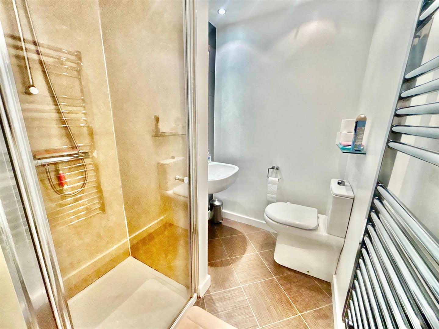 Pedestal wash hand basin, W.C, step in shower, heated towel rail, part tiled walls, Amtico flooring and extractor fan.