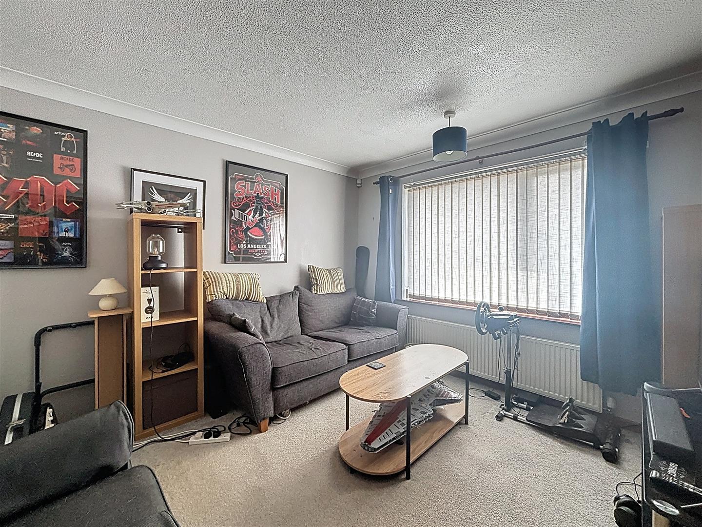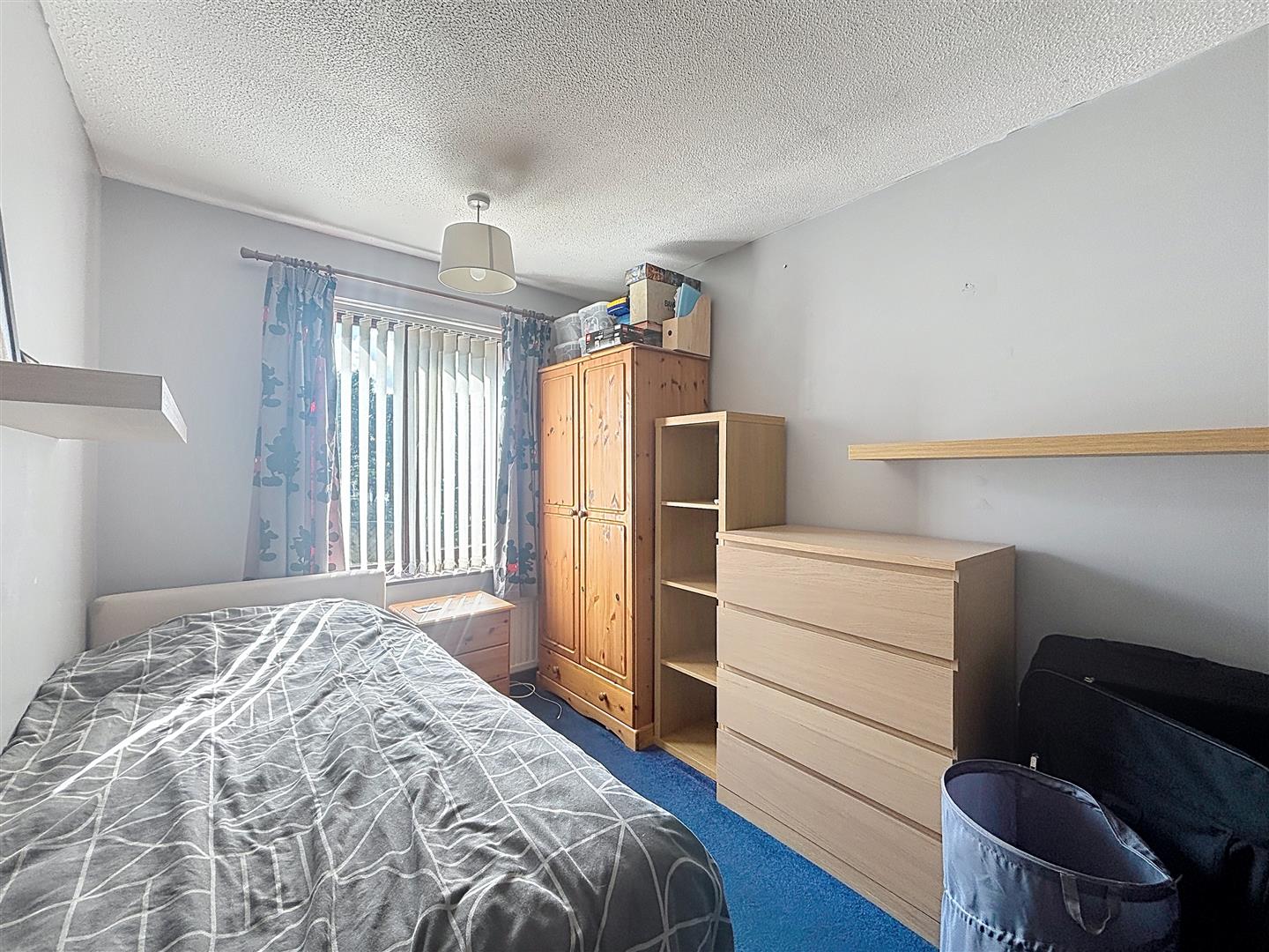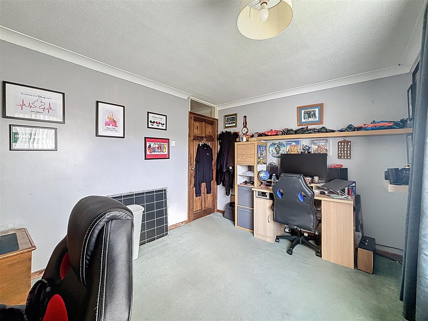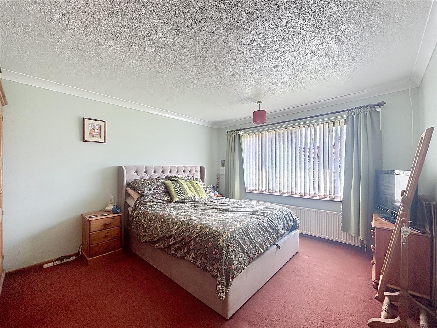 Carpeted with front facing window, Coving ceiling and radiator.
