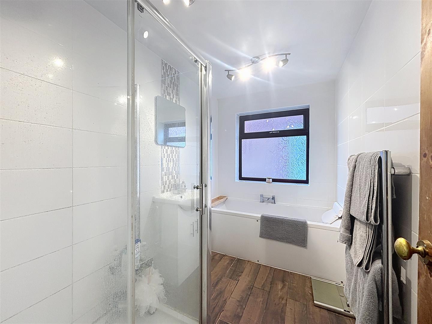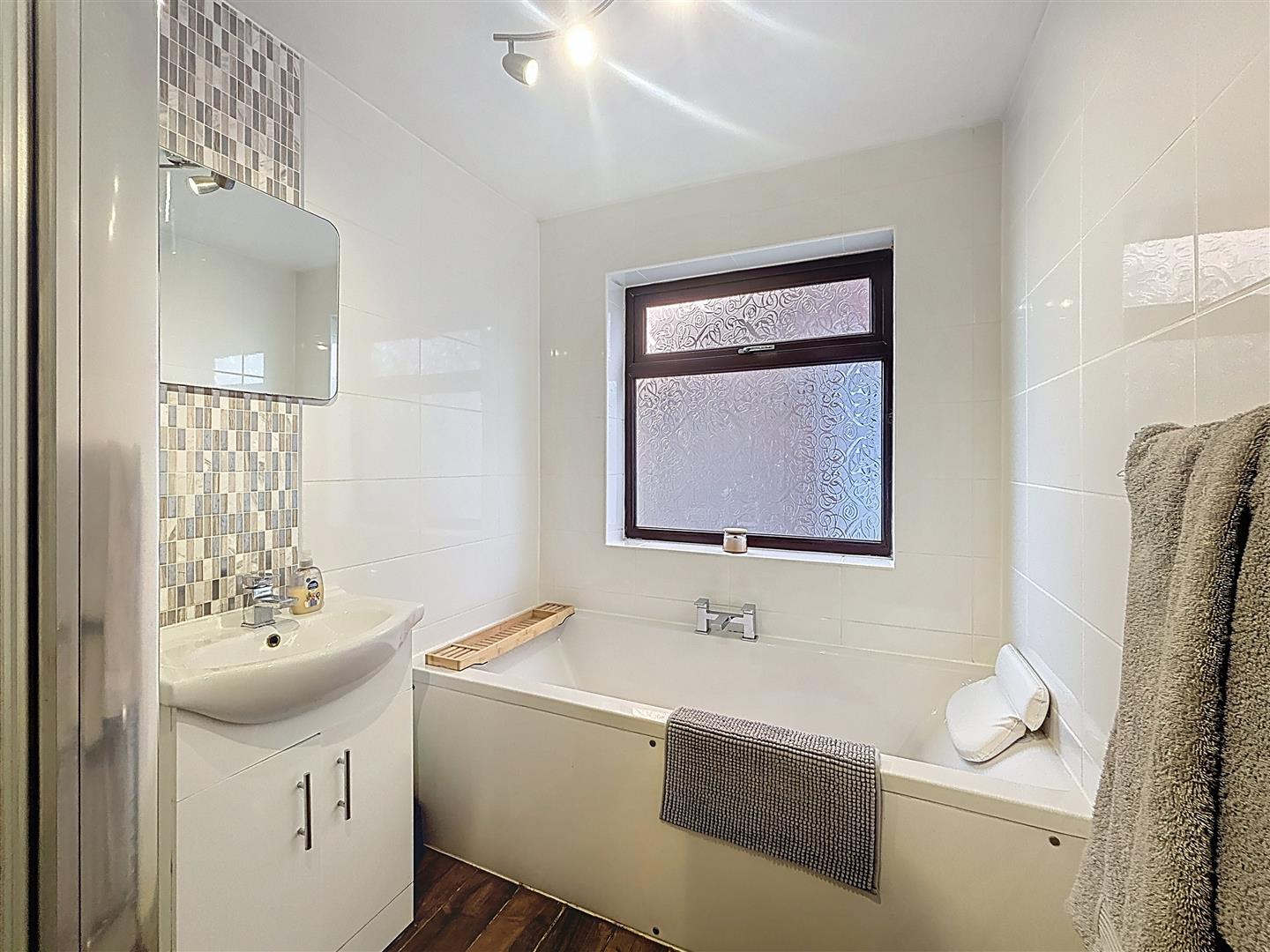 Side-facing window. The bathroom is fitted with a hand wash basin with storage beneath, a panelled bath, and a step-in shower. Additional features include a heated towel rail, tiled flooring, fully tiled walls, and an extractor fan.