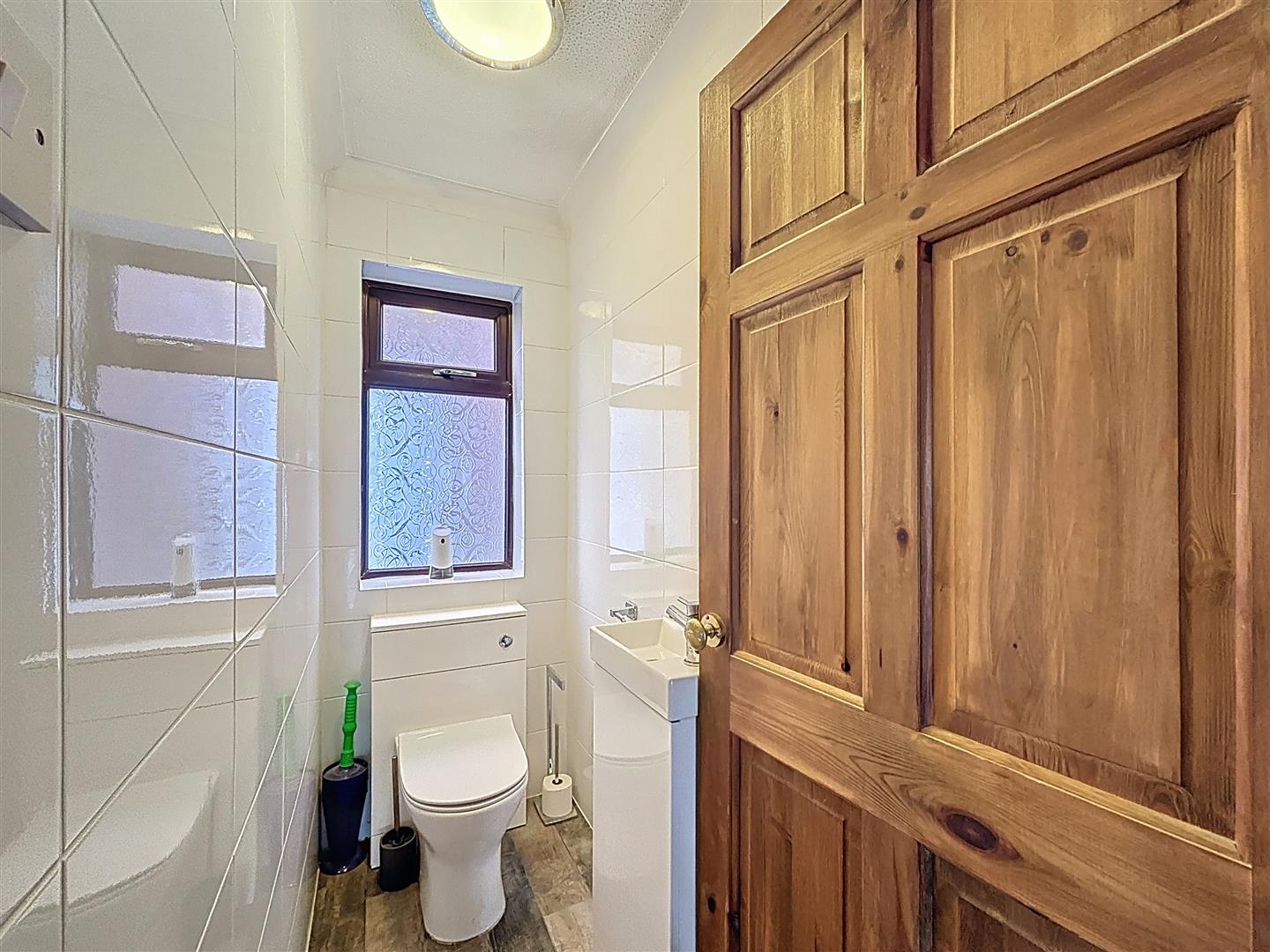 Side facing window, W.C, Hand wash basin, Tiled walls and floor with coving celing.