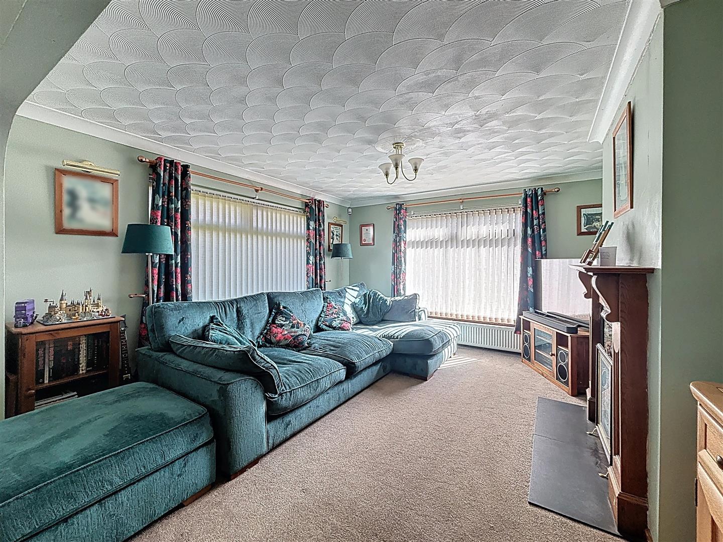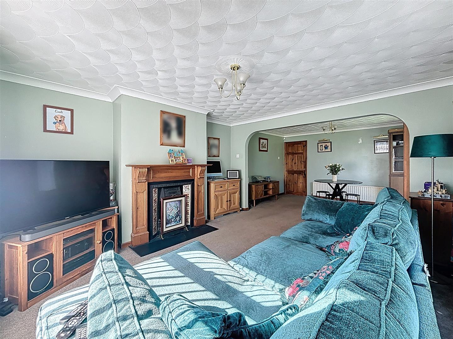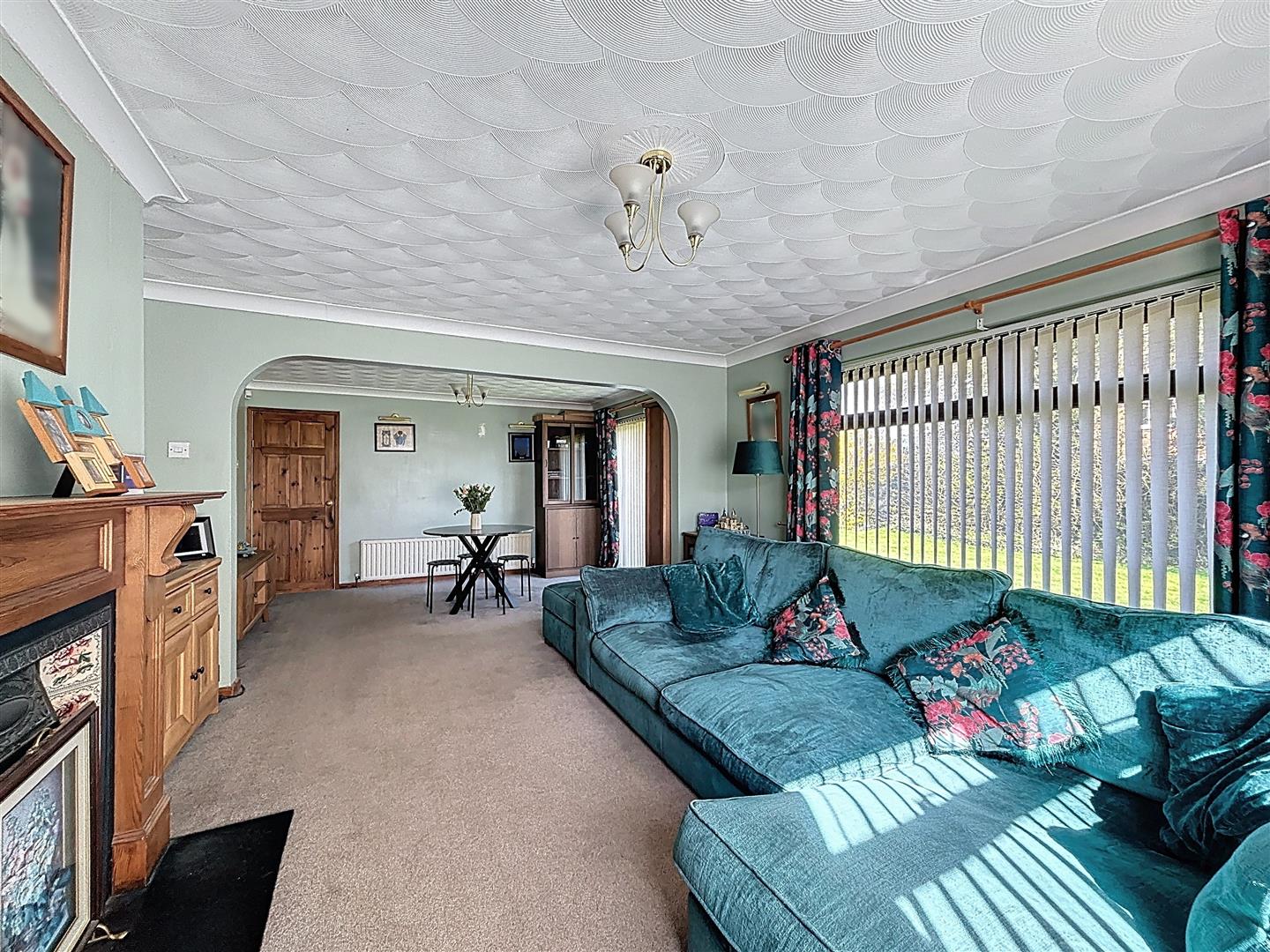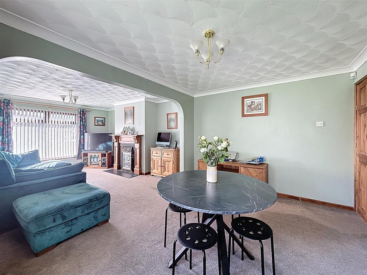 Windows facing the side and rear of the property, Patio to garden, Open fireplace with wood surroun and tiled heath, Coving to ceiling, Three radiators and carpeted.