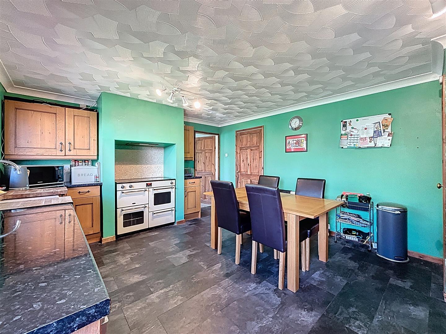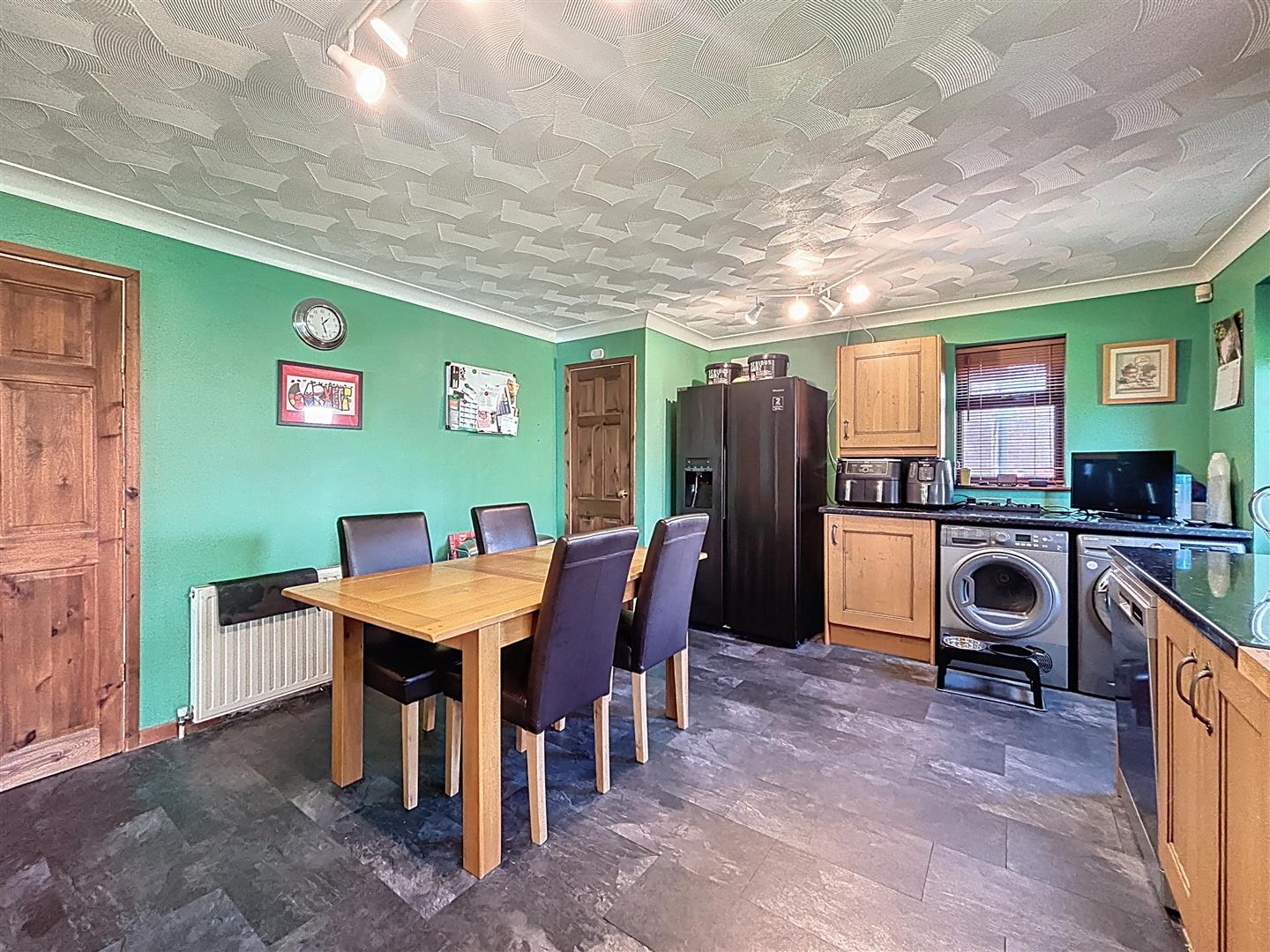 Side and rear windows, with doors leading to the garden. The kitchen is fitted with a range of wall and base units complemented by work surfaces and a Belfast sink. There is an electric cooker point with space for a range-style oven. Additional features include partly tiled walls, laminate tiled flooring, and a coving ceiling. The room also benefits from an extractor fan, radiator, and a cupboard housing the boiler and hot water tank. There is space for a washing machine, dishwasher, tumble dryer, and an American-style fridge freezer.