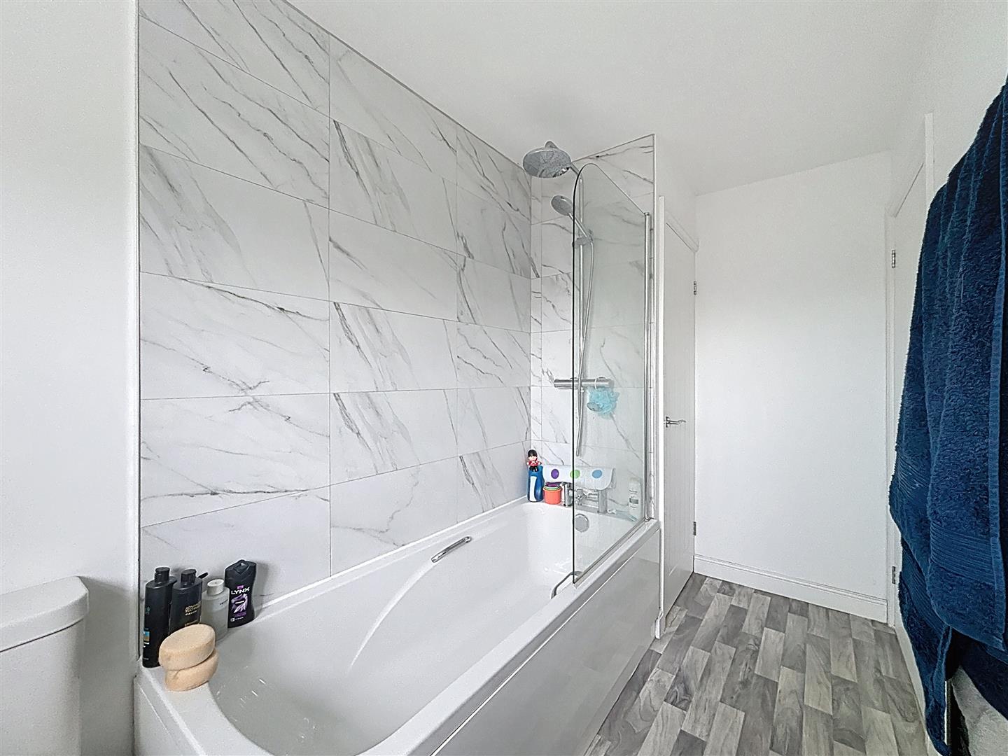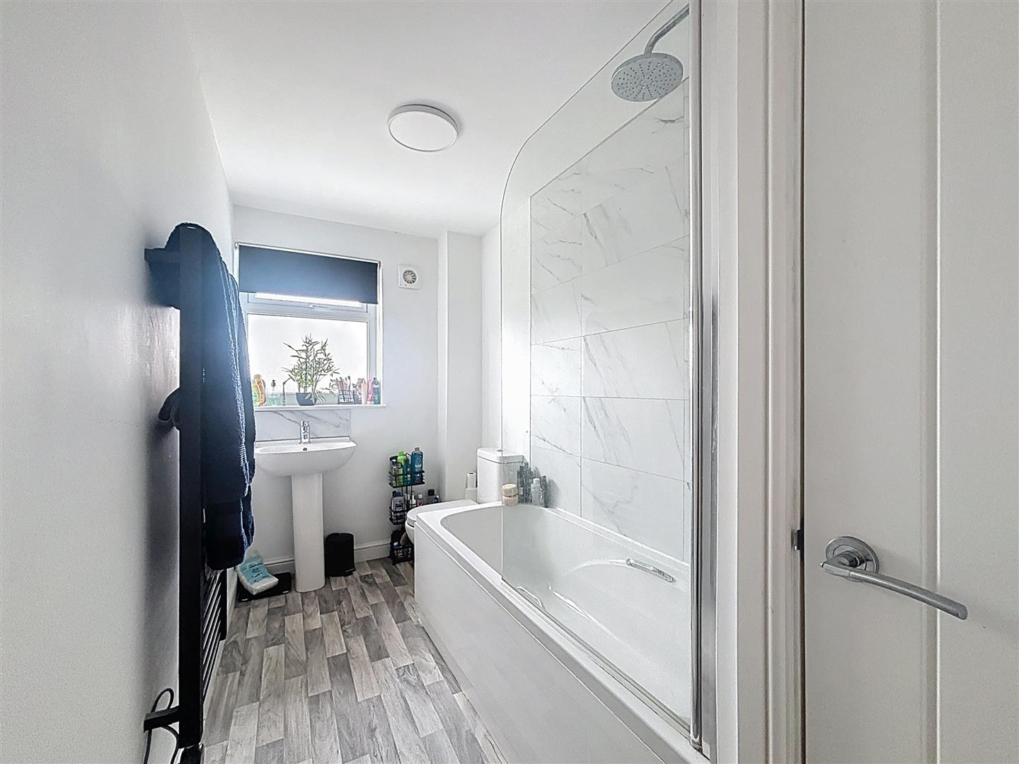 Window to rear, hand wash basin, W.C, panelled bath with shower over, heated towel rail, cupboard housing water tank. Extractor fan, vinyl flooring and part tiled walls.