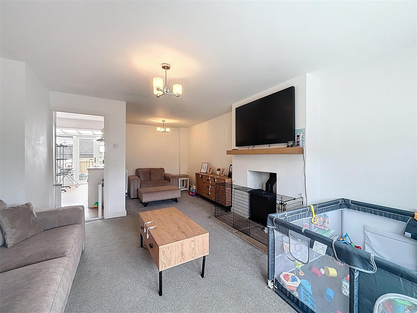 Window to front, log burner, carpet and radiator.
