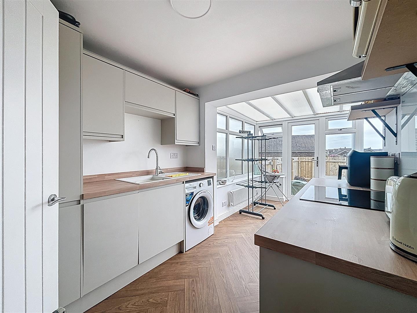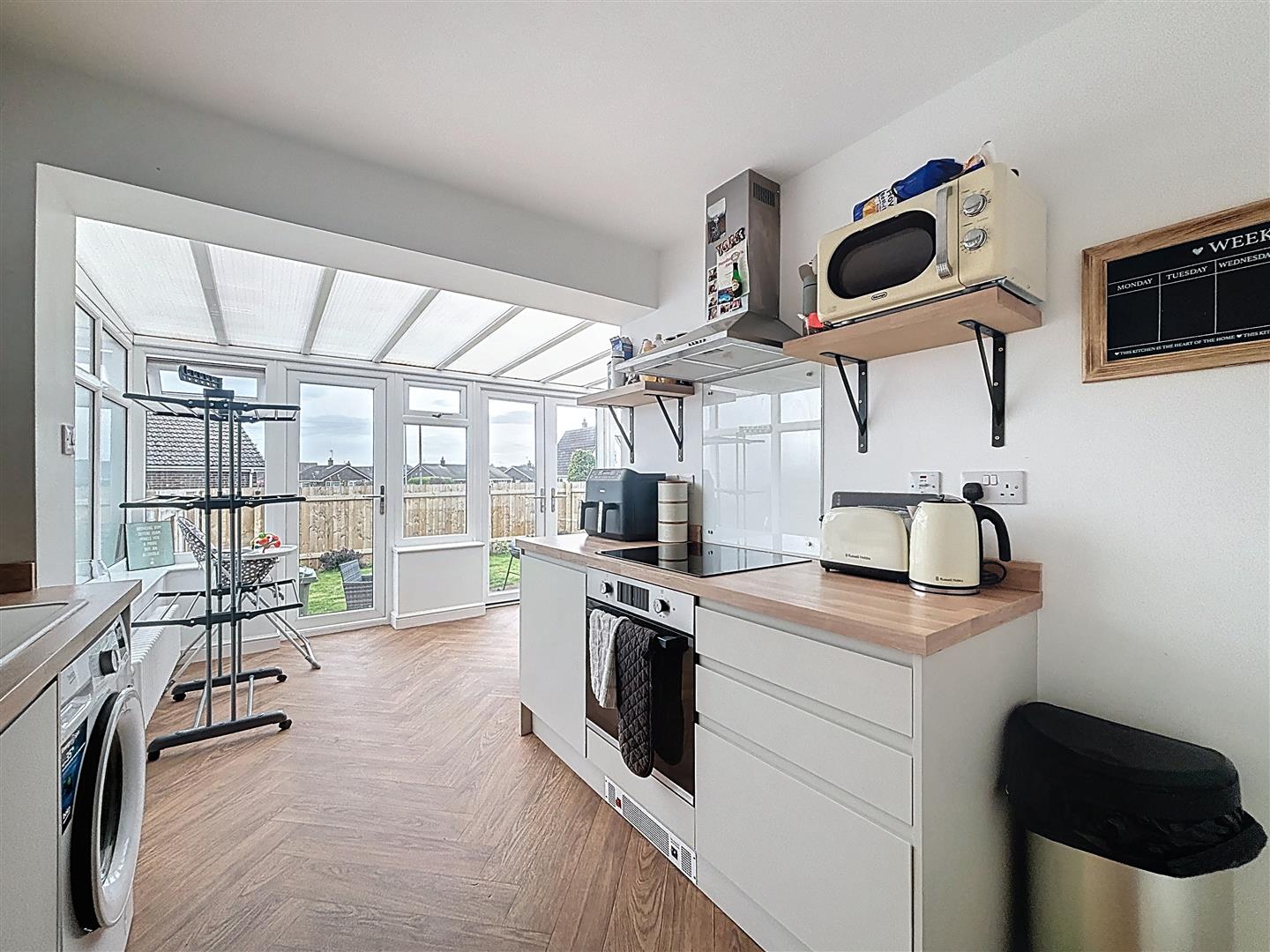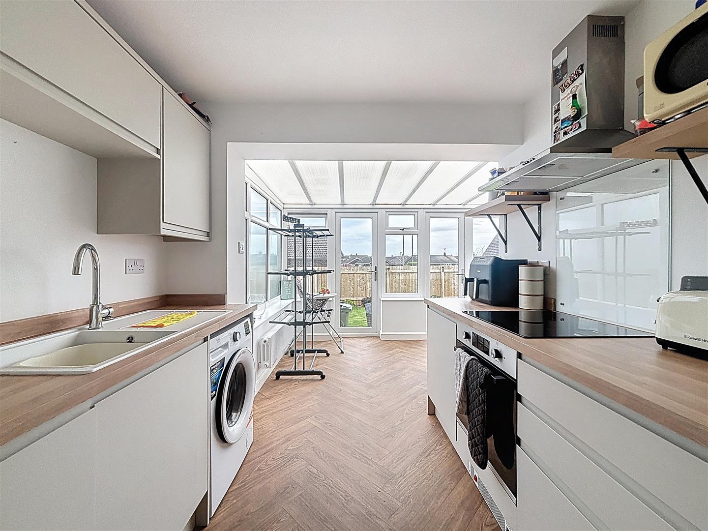 Windows to side and rear, French doors to garden. A range of fitted wall and base units with complimentary work surfaces, composite sink and drainer, space and plumbing for washing machine, integrated dishwasher and fridge freezer. Built in electric induction hob and oven, vinyl flooring. Open plan to Sunroom.
