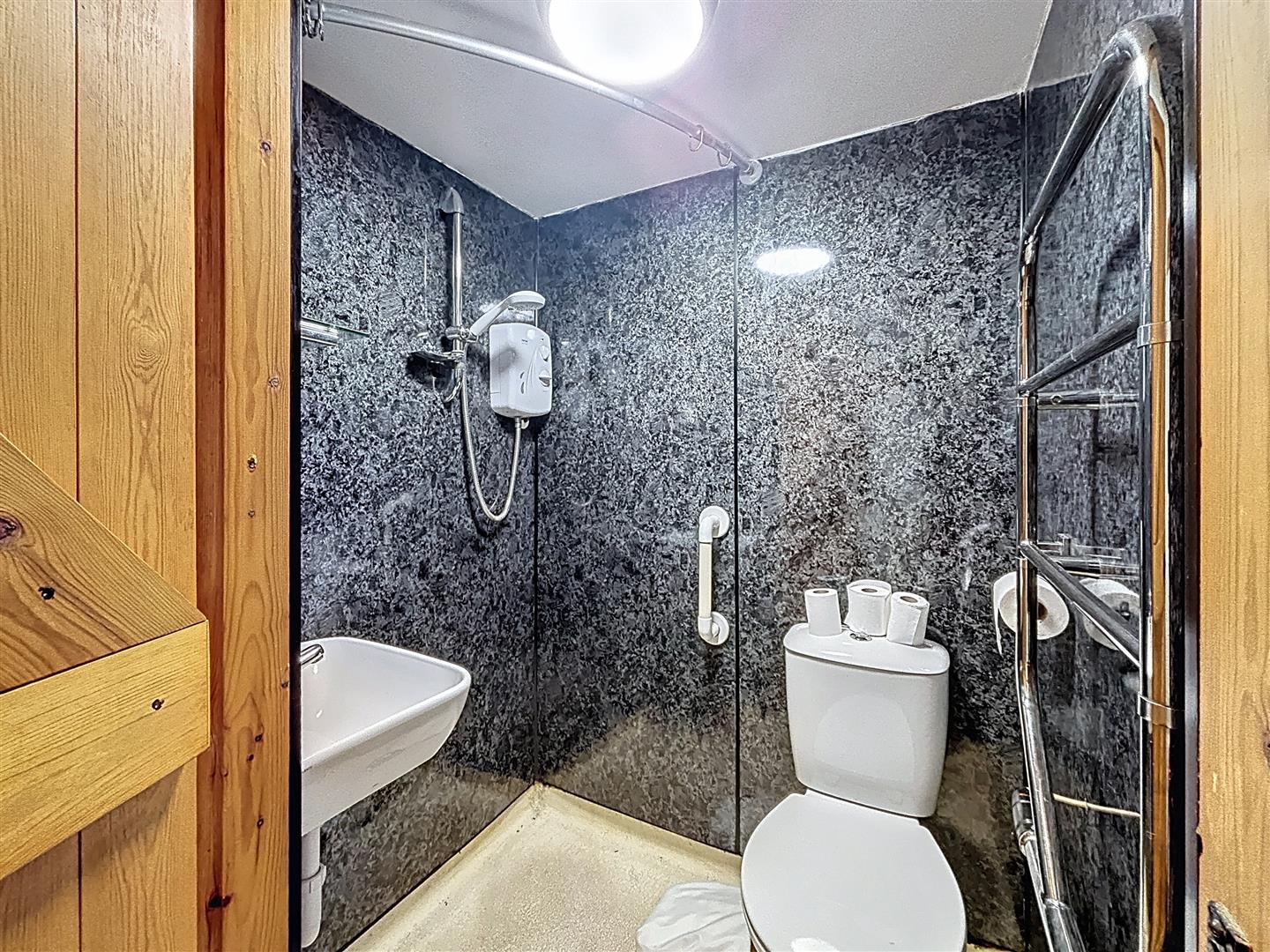 Hand wash basin, W.C, shower with shower boarding to walls, heated towel rails.