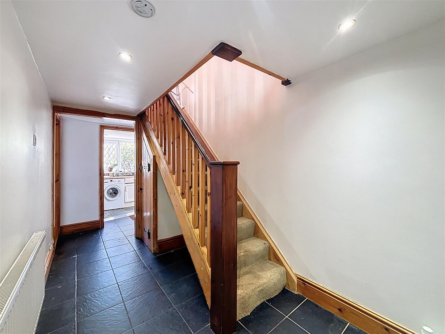 Wooden entrance door, staircase to first floor with understairs cupboard, tiled floor and radiator.