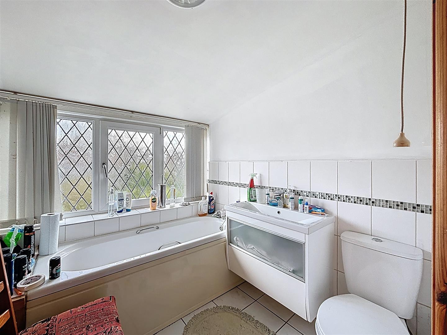 Window to the rear. W.C., hand wash basin and panelled bath. Heated towel rail, part tiled walls, tiled floor, heated towel rail and radiator,