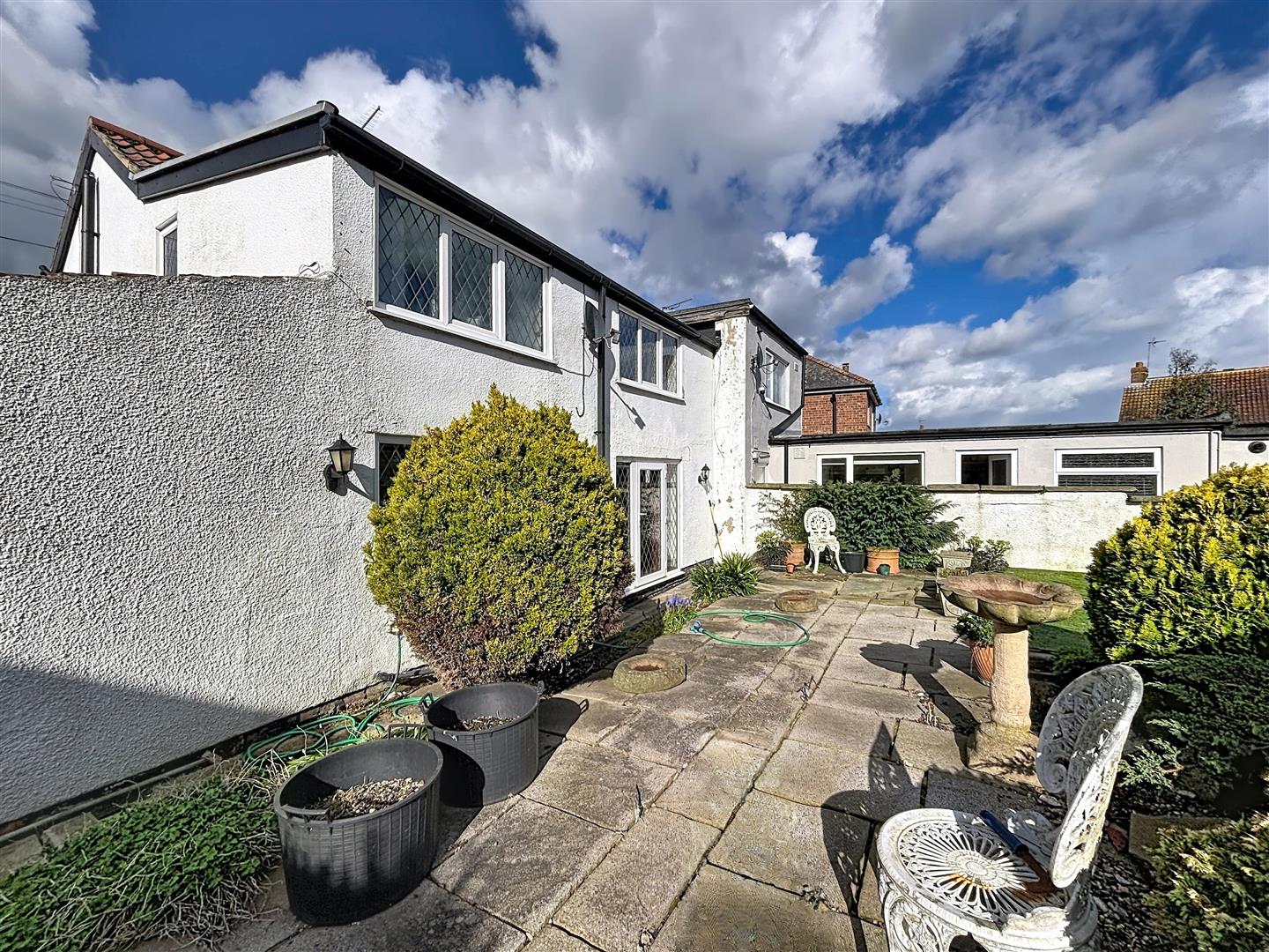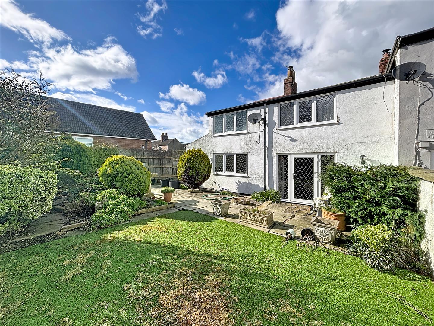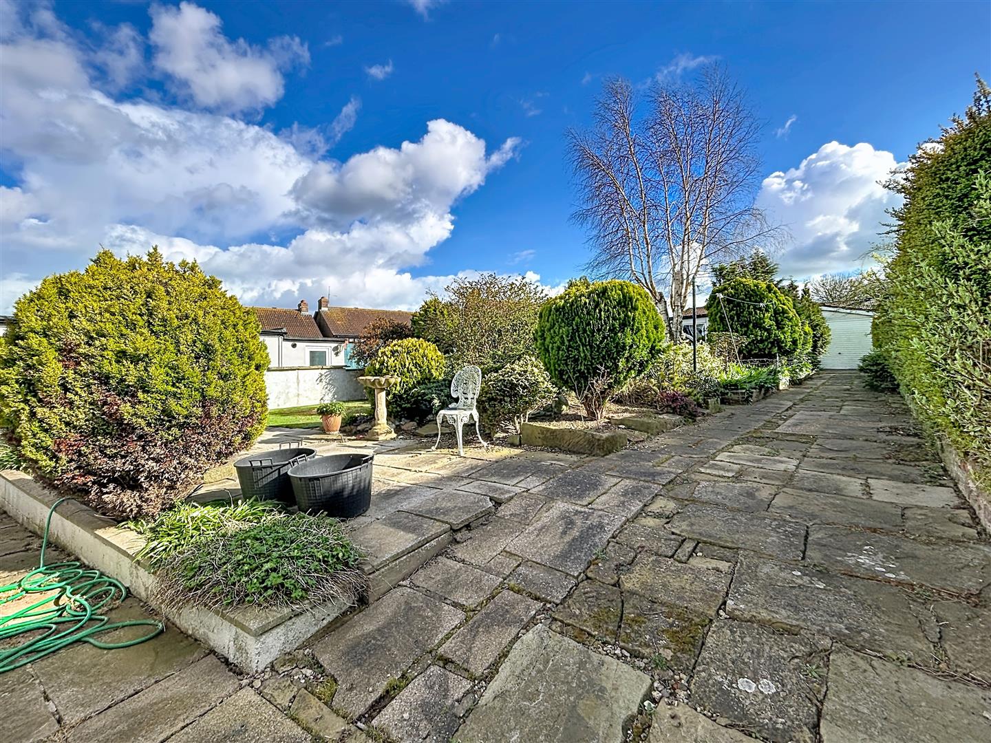 Laid partly to lawn with paved areas, this is a pretty cottage garden that benefits from being south facing. There are planted borders and rockeries, along with an outside tap.