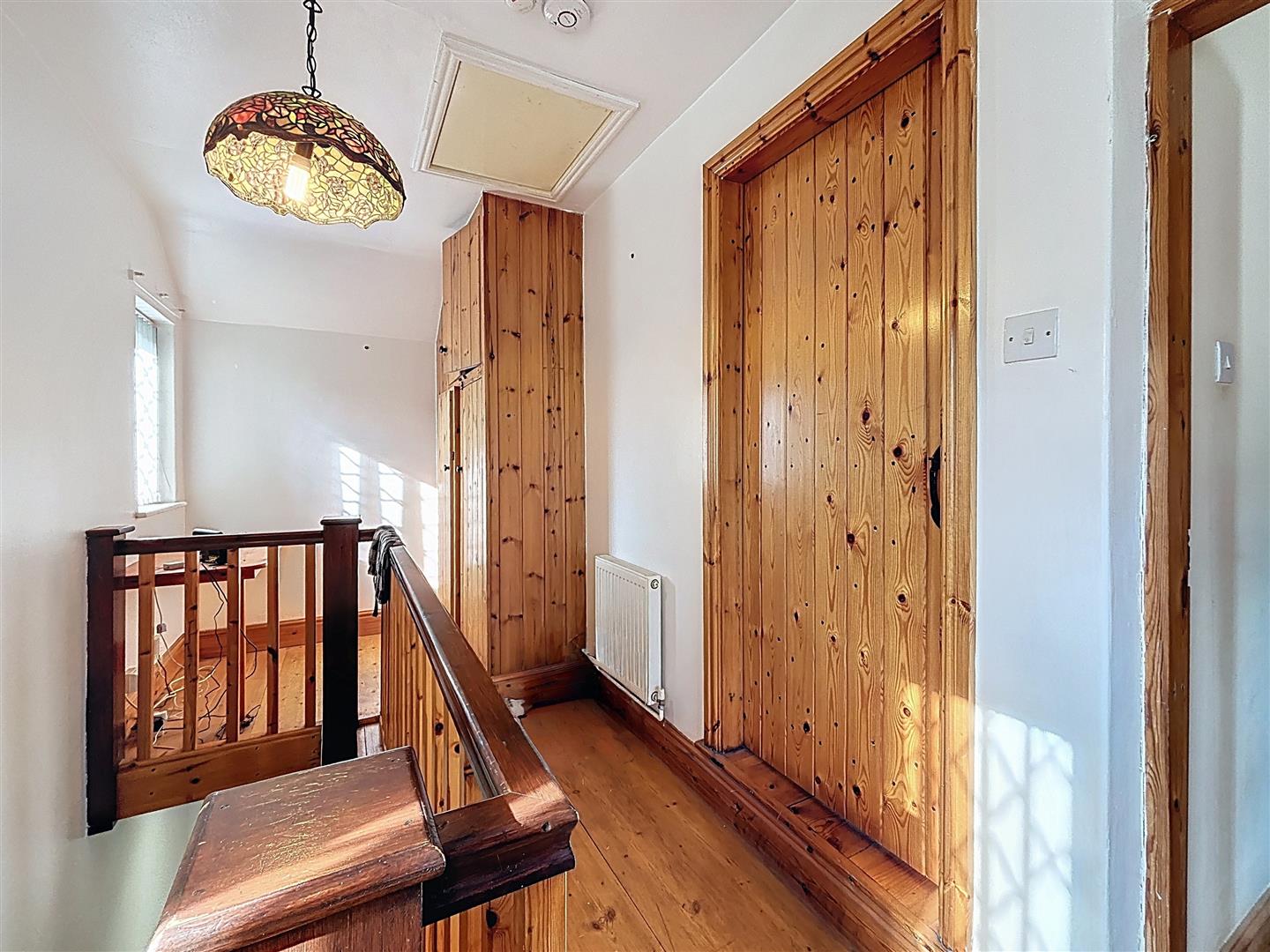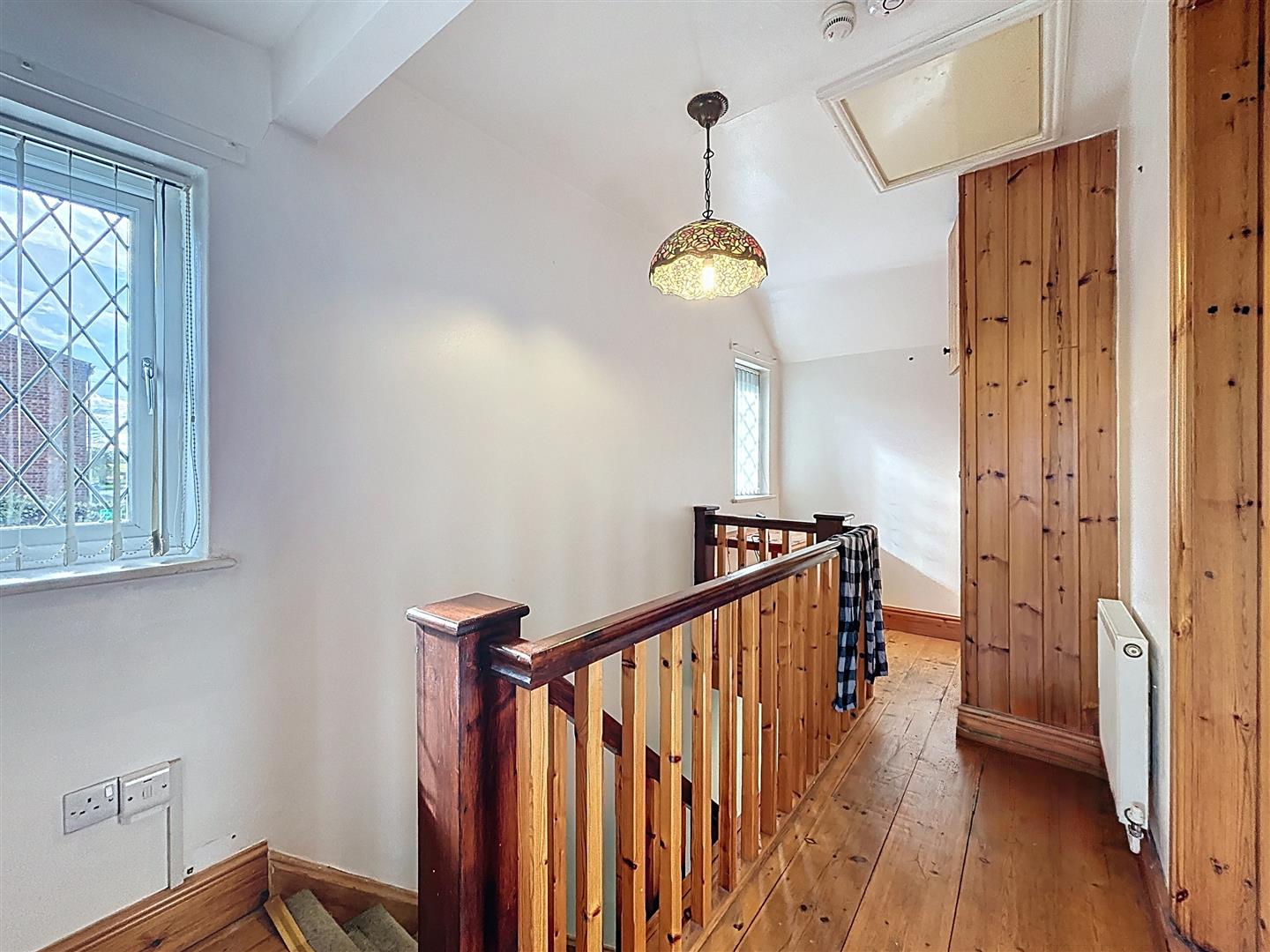 Two windows to the side and wooden floor. Cupboard housing hot water tank. Radiator and spindle banister. Useful area, used by the previous owner as an office space.