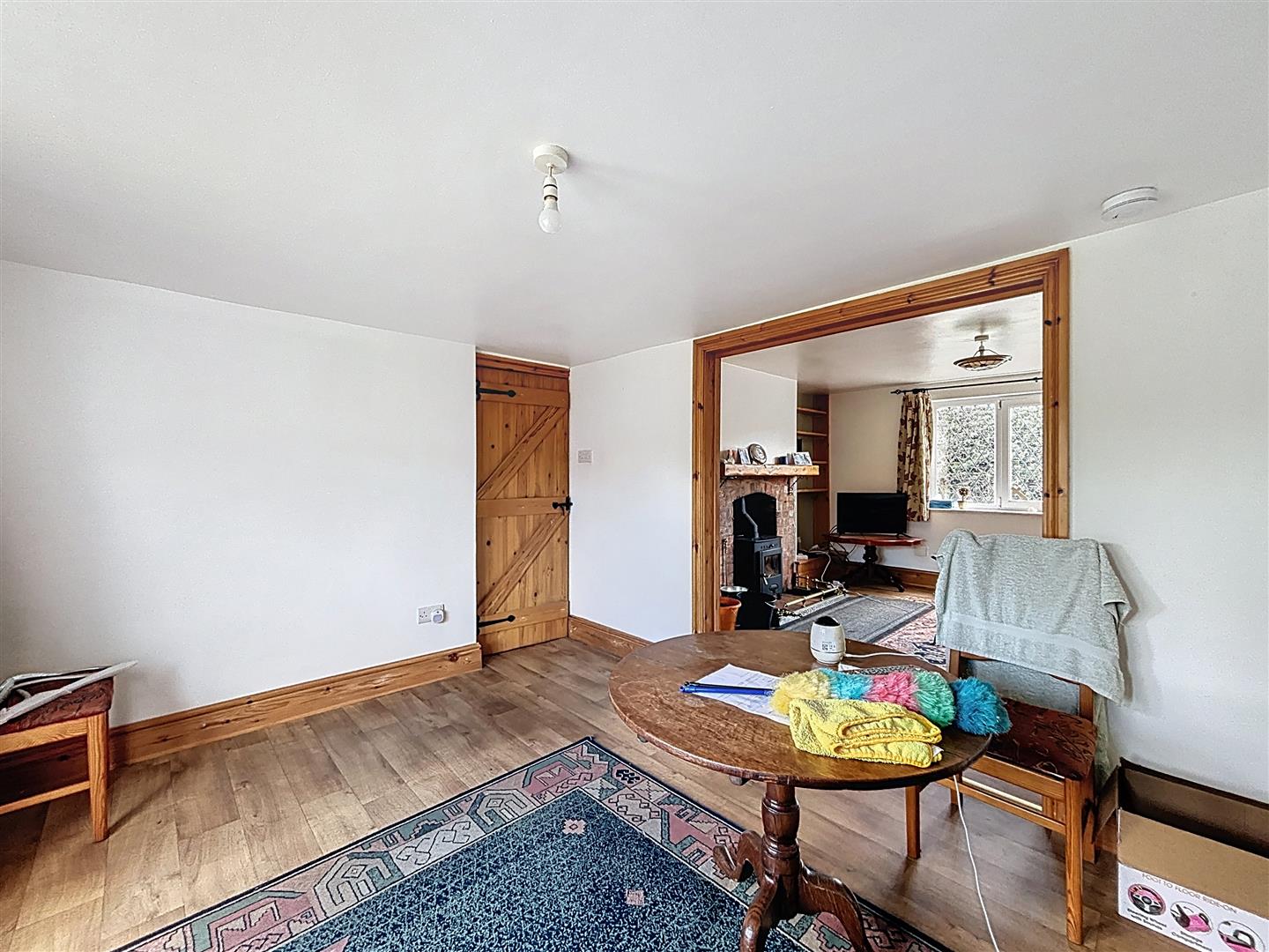 Window to front, fireplace housing multi-fuel burner with tiled hearth and brick inset. Built in storage to sides. Vinyl flooring and radiator.
